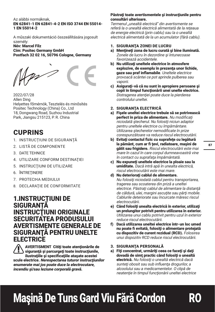 Nome Marcel Filz Endereço_ Positec Germany GmbH Postfach 32 02 16, 50796 Cologne, Germany De conditie en de onderhoudstoestand van de machine. Gebruik van de juiste toebehoren. Zorg ervoor dat ze scherp zijn en in goede conditie. Hoe stevig de handgreep wordt vastgehouden en of er antHtrlling en -geluidsaccessoires worden gebruikt. De machine moet gebruik worden zoals door de ontwerper bedoeld is en in overeenstemming met deze instructies.