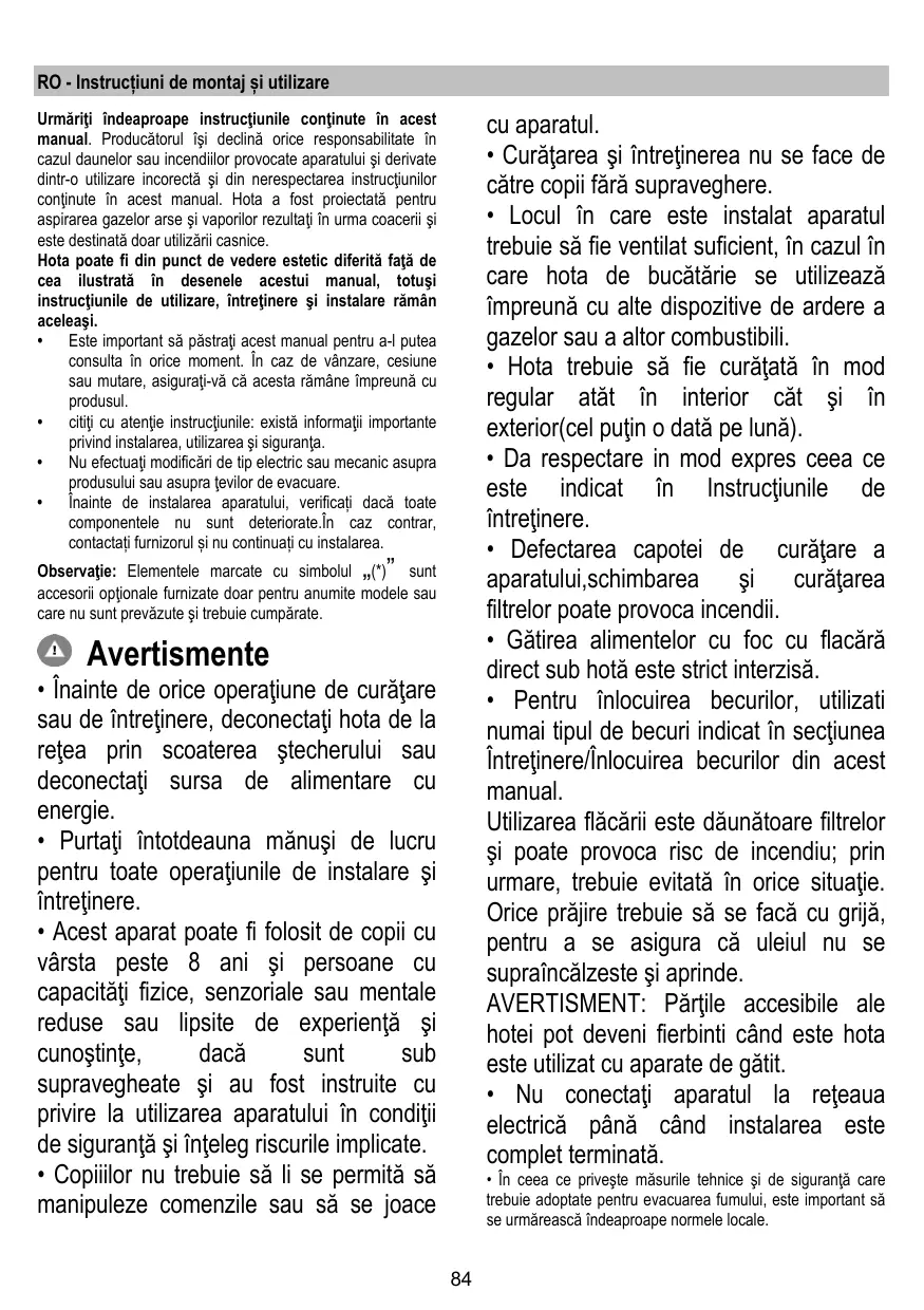 + La pièce doit avoir une aération suffisante lorsque la hotte est utilisée conjointement avec d'autres appareils fonctionnant au gaz ou autres combustibles.