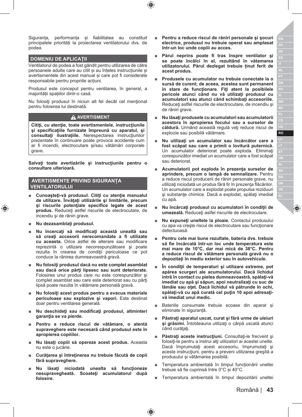DOMENIU DE APLICATII Ventilatorul de podea a fost gândit pentru utiizarea de cätre persoanele adulte care au citit si au inteles instrucfiunile si avertismentele din acest manual si care pot fi considerate responsabile pentru propriile actiuni
