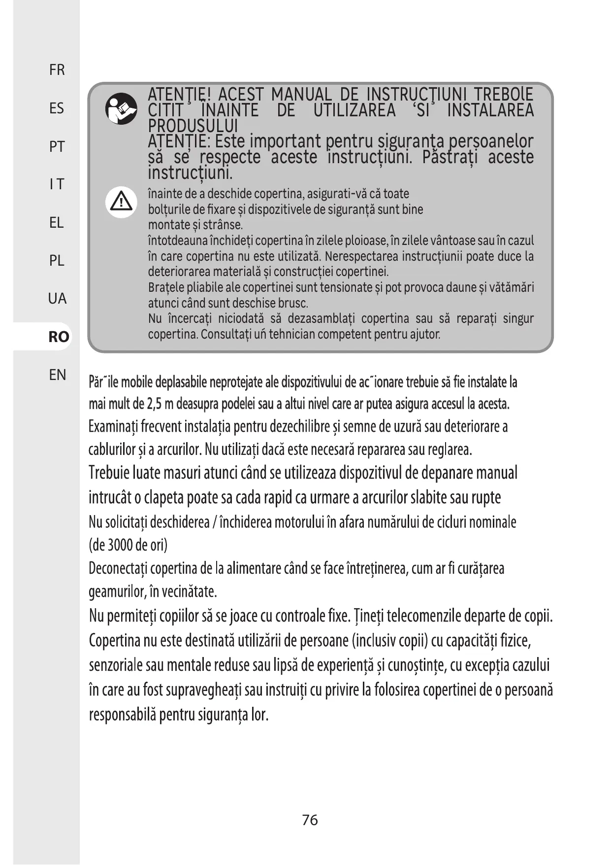4. UTILISATION Charge maximale pour la partie non-rétractable : 800Pa.