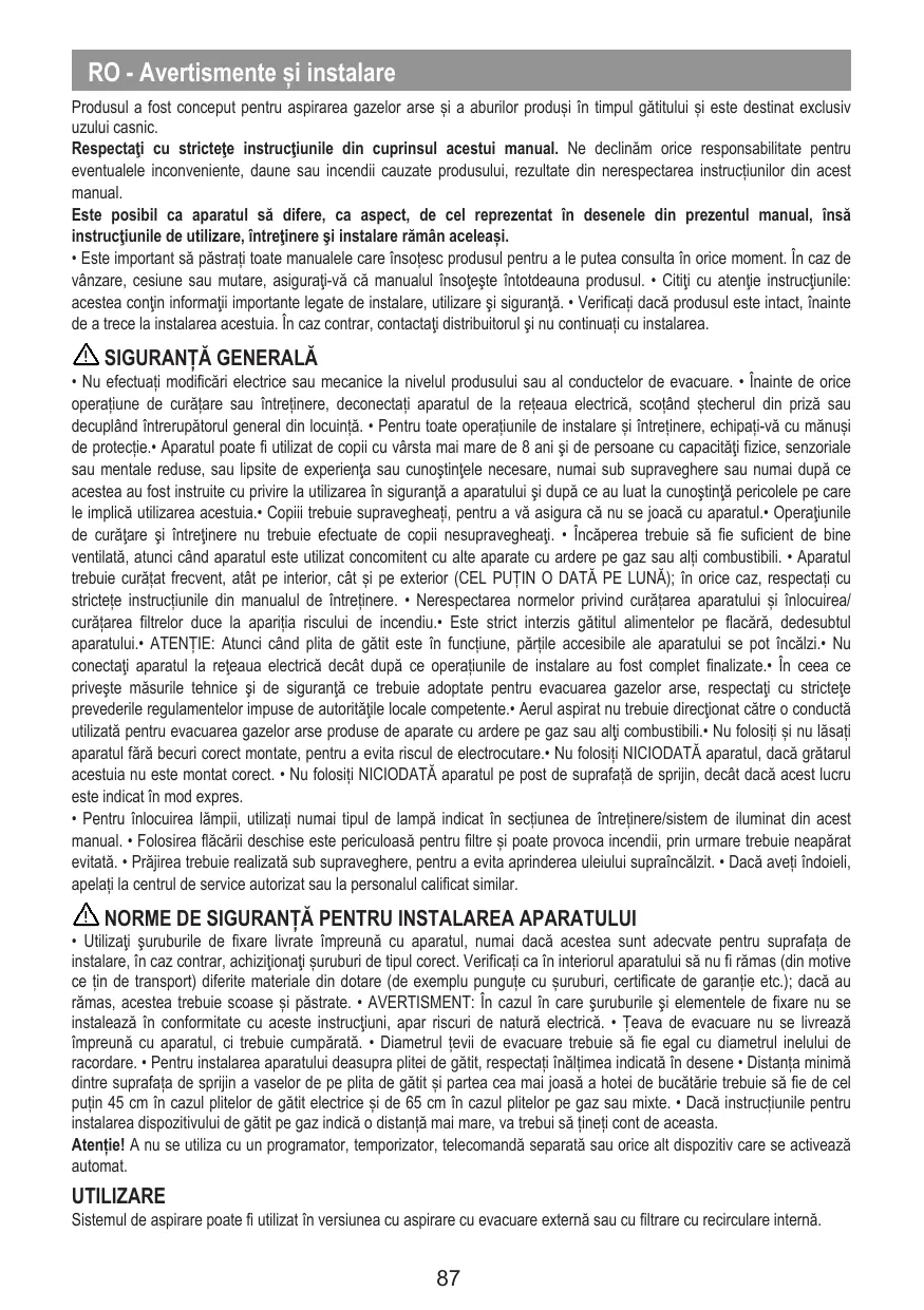 + Nu efectuali modificär electrice sau mecanice la nivelul produsului sau al conductelor de evacuare. + inainte de orice operaliune de curätare sau intretinere, deconectali aparatul de la reteaua electricä, scotänd stecherul din prizä sau decupländ intrerupätorul general din locuintä. + Pentru toate operafiunile de instalare si intrefinere, echipati-vä cu mänusi de protect. Aparalul poate f utlizat de copii cu vârsta mai mare de 8 ani si de persoane cu capacitäffizice, senzoriale sau mentale reduse, sau lpsite de experienta sau cunostintele necesare, numaï sub supraveghere sau numaï dupä ce acestea au fost instruite cu privire la utlizarea in sigurantä a aparatului si dupä ce au luat la cunostintä pericolele pe care le implicä utiizarea acestuia.+ Copi trebuie supravegheal, pentru a vä asigura cà nu se joacä cu aparatul.+ Operafunile de curëlare $i intrefinere nu trebuie efectuate de copii nesupravegheaÿ. + incäperea trebuie sà fie suficient de bine ventilaté, atunci când aparatul este utilzat concomitent cu alle aparate cu ardere pe gaz sau ali combustibil + Aparatul trebuie curätat frecvent, atât pe interior, cât si pe exterior (CEL PUTIN O DATA PE LUNA): in orice caz, respectafi cu stictete instructunile din manualul de intrefinere. + Nerespectarea normelor priind curéfarea aparalului si inlocuirea/ curëtarea firelor duce la aparita riscului de incendiu.+ Este strict interzis gâtitul alimentelor pe flacärä, dedesubtul aparalului.+ ATENTIE: Atunci când plta de gâtit este în funciune, pärlle accesibile ale aparatului se pot incälzi.+ Nu conectali aparatul la refeaua electric decât dupä ce operafiunile de instelare au fost complet fnalizate.… in ceea ce priveste mäsurile tehnice si de sigurantä ce trebuie adoptate pentru evacuarea gazelor arse, respectali cu stictele prevederile regulamentelor impuse de autortäfile locale competente.+ Aerul aspirat nu trebuie direcfionat câtre o conductä utlizatä pentru evacuarea gazelor arse produse de aparate cu ardere pe gaz sau ali combustibil.» Nu folositi si nu läsali aparalul férä becuri corect montate, pentru a evita riscul de electrocutare.+ Nu folositi NICIODATÀ aparatul, dacä grätarul acestuia nu este montat corect. + Nu folositi NICIODATA aparatul pe post de suprafatä de spriin, decät dacä acest lucru este indicat in mod expres.