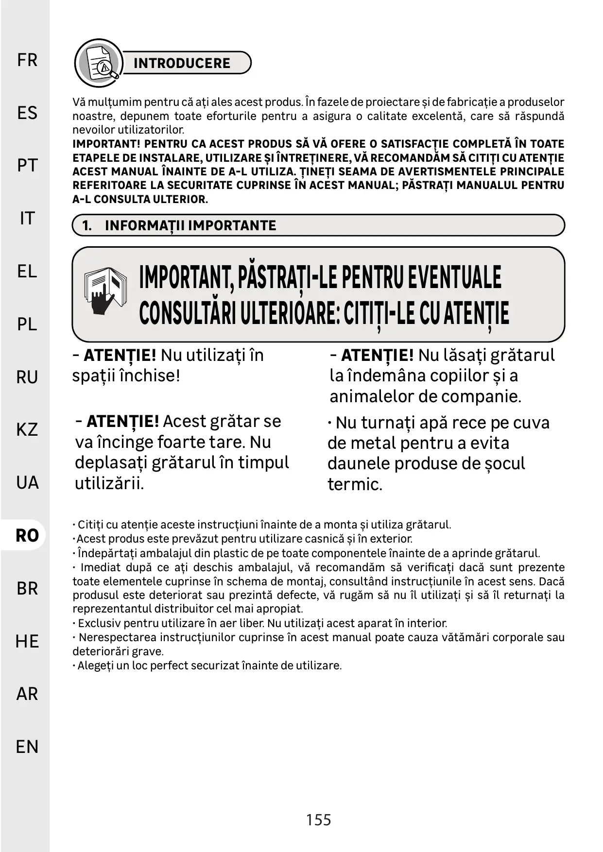 IMPORTANT! PENTRU CA ACEST PRODUS SÀ VA OFERE O SATISFACTIE COMPLETÀ ÎN TOATE ETAPELE DE INSTALARE, UTILIZARE SI ÎNTRETINERE, v RECOMANDAM SÀ CITITI CU ATENTIE ACEST MANUAL ÎNAINTE DE A-L UTILIZA. TINETI SEAMA DE AVERTISMENTELE PRINCIPALE REFERITOARE LA SECURITATE CUPRINSE îN ACEST MANUAL; PASTRATI MANUALUL PENTRU A-L CONSULTA ULTERIOR.