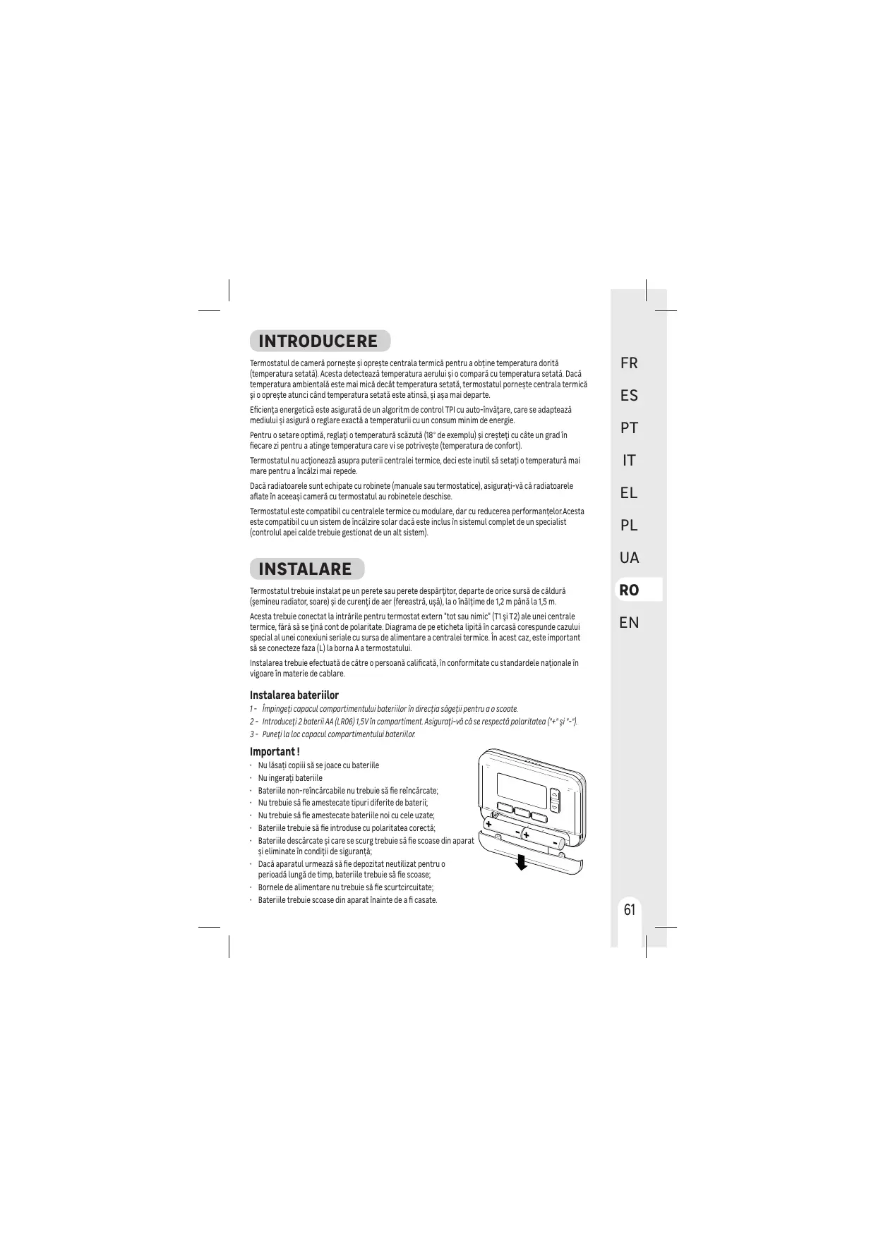 2- insérer 2 piles AA (LROG) 1,5 Vdans le compartiment S'assurer qu La polar (“+" et “-" es respectée.