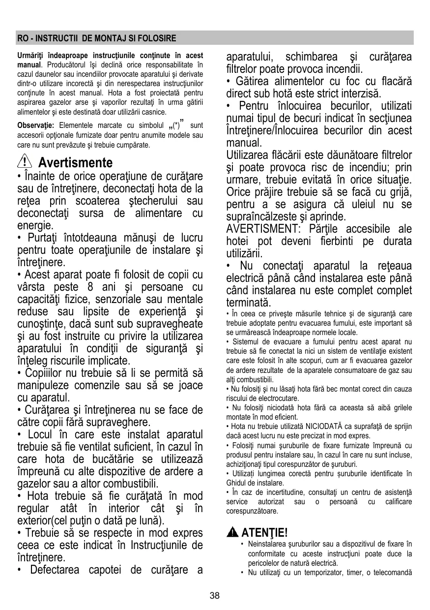 + La pièce doit avoir une aération suffisante lorsque la hotte est utilisée conjointement avec d'autres appareils fonctionnant au gaz ou autres combustibles.