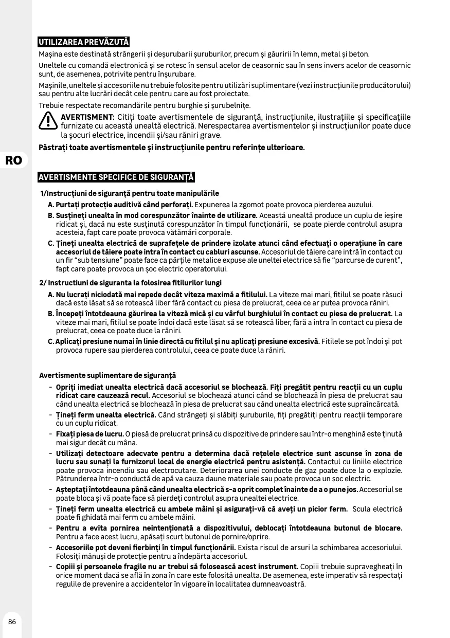 — Risque d'électrocution en cas de perçage de câbles électriques Saisissez toujours l'outil par Les poignées prévues à cet effet, ne touchez pas les mèches de perçage
