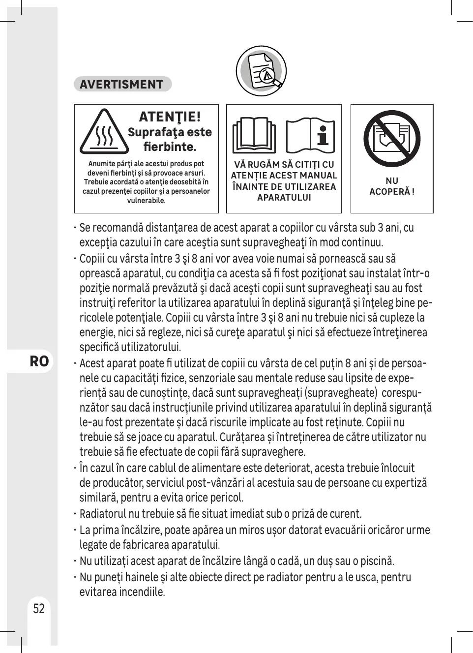 + Ne mettez pas directement les vêtements et autres articles sur l'appareil pour les réchauffer afin d'éviter un incendie. 3