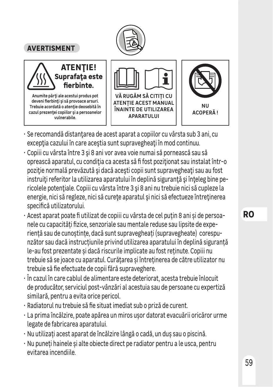 + Ne pas utiliser cet appareil de chauffage à proximité d'une baignoire, d'une douche, ou d'une piscine.
