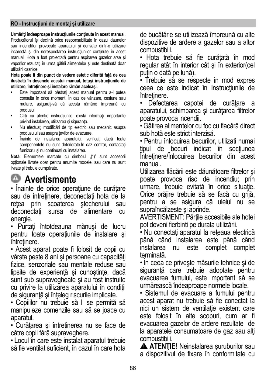 + La hotte ne doit JAMAIS être utilisée comme une surface d'appui, sauf indication expresse.