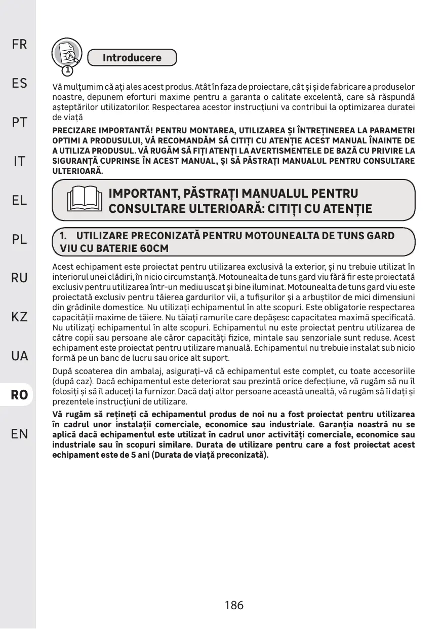 1. UTILIZARE PRECONIZATÀ PENTRU MOTOUNEALTA DE TUNS GARD VIU CU BATERIE 60CM Acest echipament este proiectat pentru utilizarea exclusivä la exterior, si nu trebuie utilizat în interiorulunei clädiri, in nicio circumstantä. Motounealta de tuns gard viu färä fir este proiectatà exclusiv pentruutilizareaîntr-un mediu uscat si bine iluminat. Motounealta de tuns gard viu este proiectatä exclusiv pentru täierea gardurilor vii, a tufisurilor si a arbustilor de mici dimensiuni din grädinile domestice. Nu utilizati echipamentul în alte scopuri. Este obligatorie respectarea capacitätii maxime de täiere. Nu täiati ramurile care depäsesc capacitatea maximä specificatà. Nu utilizati echipamentul in alte scopuri. Echipamentul nu este proiectat pentru utilizarea de cätre copii sau persoane ale cäror capacitäti fizice, mintale sau senzoriale sunt reduse. Acest echipament este proiectat pentruutilizare manualà. Echipamentul nu trebuie instalat sub nicio formä pe un banc de lucru sau orice alt suport.