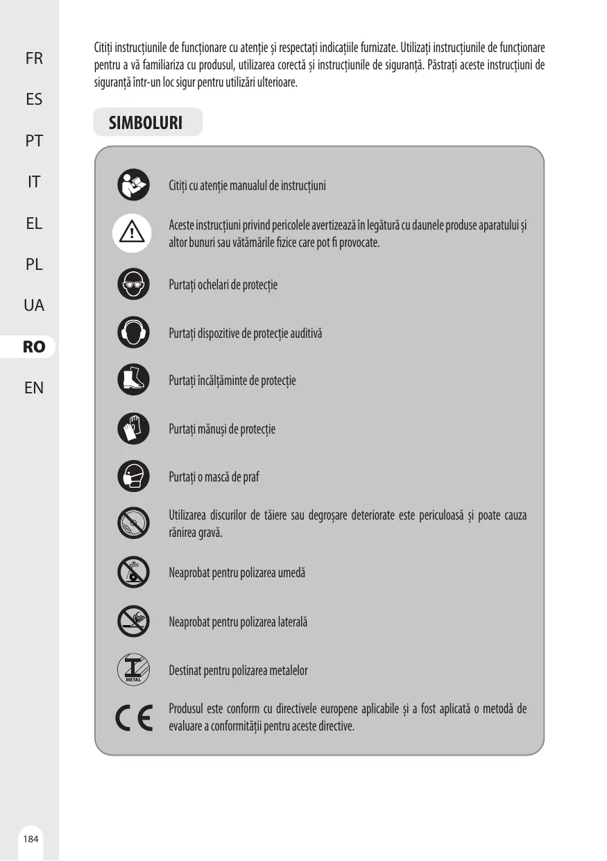 H. Chiar dacä aveti cunostinte dobändite ca urmare a utilizärii frecvente a uneltelor de lucru în general, nu vä bazati pe acestea, di fiti intotdeauna vigilent si aplicati prindpiile privind siguranta uneltei. Orice actiune neglijentä poate provoca räniri grave intr-o fractiune de secundä.