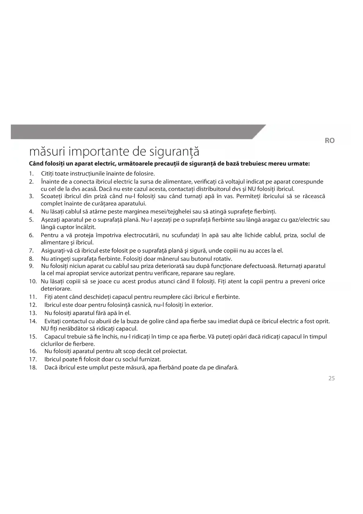 - Pentru a va proteja impotriva electrocutarii, nu scufundati in apa sau alte lichide cablul, priza, soclul de alimentare si ibricul.