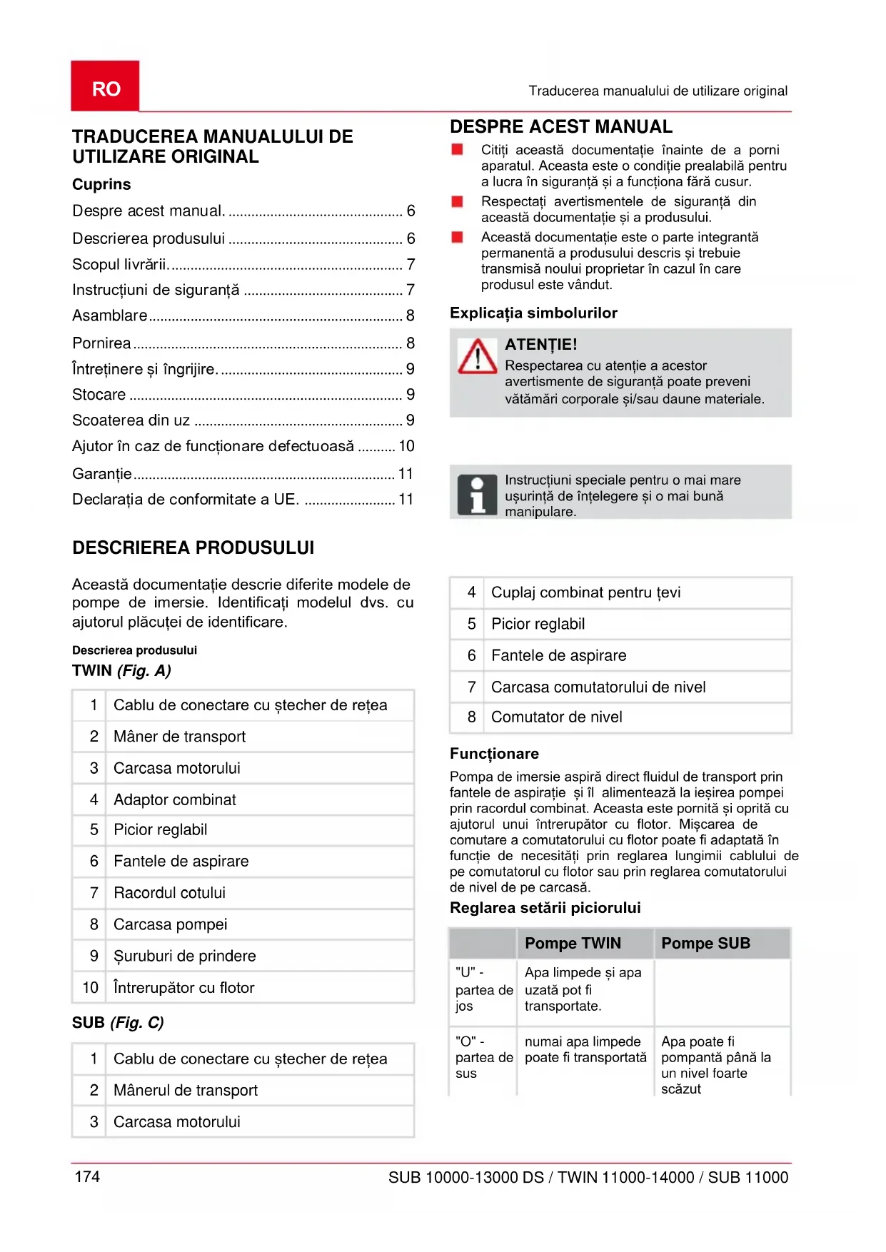 Citiți această documentație înainte de a porni aparatul. Aceasta este o condiție prealabilă pentru a lucra în siguranță și a funcționa fără cusur. Respectați avertismentele de siguranță din această documentație și a produsului. Această documentație este o parte integrantă permanentă a produsului descris și trebuie transmisă noului proprietar în cazul în care produsul este vândut. Explicația simbolurilor DESCRIEREA PRODUSULUI Această documentație descrie diferite modele de pompe de imersie. Identificați modelul dvs. cu ajutorul plăcuței de identificare. Descrierea produsului TWIN (Fig. A)