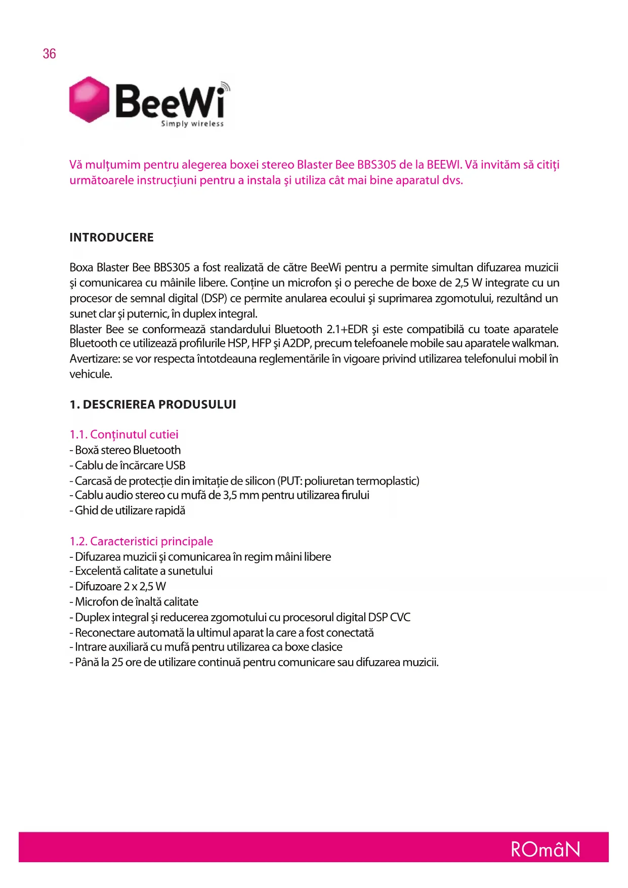 1.1. Conţinutul cutiei - Boxă stereo Bluetooth - Cablu de încărcare USB - Carcasă de protecţie din imitaţie de silicon (PUT: poliuretan termoplastic) - Cablu audio stereo cu mufă de 3,5 mm pentru utilizarea rului - Ghid de utilizare rapidă 1.2. Caracteristici principale - Difuzarea muzicii şi comunicarea în regim mâini libere - Excelentă calitate a sunetului - Difuzoare 2 x 2,5 W - Microfon de înaltă calitate - Duplex integral şi reducerea zgomotului cu procesorul digital DSP CVC - Reconectare automată la ultimul aparat la care a fost conectată - Intrare auxiliară cu mufă pentru utilizarea ca boxe clasice - Până la 25 ore de utilizare continuă pentru comunicare sau difuzarea muzicii. Vă mulţumim pentru alegerea boxei stereo Blaster Bee BBS305 de la BEEWI. Vă invităm să citiţi următoarele instrucţiuni pentru a instala şi utiliza cât mai bine aparatul dvs. ROmâN37 1.3. Prezentarea produsului Deschis/Închis: comutator pornit/oprit Conector de încărcare (compatibil micro USB) Conector cu mufă de 3,5 mm: intrare auxiliară cu mufă Buton multifuncţional, funcţionare şi pauză pentru muzică, preluare apeluri, punere pe împerechere indicator luminos Buton comandă piste & Buton de reglare a volumului VOL /VOL microfon 1.4. Caracteristicile produsului