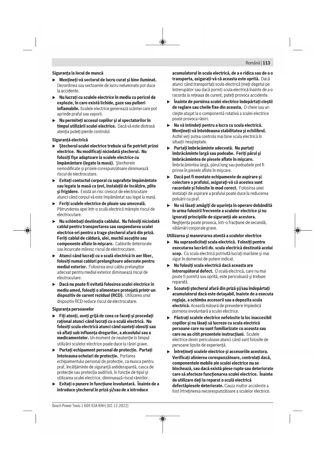 – электр құралына артық жүктеме түскеннен орын алған ақаулар. (Құралға артық жүктеме түсудің шартсыз белгілеріне мыналар жатады: құбылу түсінің пайда болуы немесе электр құралы бөліктері мен түйіндерінің деформациясы немесе қорытылуы, жоғары температура әсерінен электр қозғалтқышындағы сымдар оқшаулағышының қараюы немесе көмірленуі.) Кәдеге жарату Электр құралдар, жабдықтар және бумаларын айналаны қорғайтын кәдеге жаратуға апару қажет. Электр құралдарды үй қоқысына тастамаңыз! Тек қана ЕО елдері үшін: Электр және электрондық ескі құралдар бойынша Еуропа 2012/19/EU ережесі және ұлттық заңдарға сайкес пайдалануға жарамсыз электр құралдары бөлек жиналып, кәдеге жаратылуы қажет. Қате жолмен кәдеге жаратылған ескі электрлік және электрондық құрылғылар қауіпті заттардың болу мүмкіндігіне байланысты қоршаған ортаға және адам денсаулығына зиянды әсер тигізуі мүмкін. Română Instrucţiuni de siguranţă Instrucţiuni generale de siguranţă pentru scule electrice AVERTIS- MENT Citiţi toate avertizările, instrucţiunile, ilustraţiile şi specificaţiile puse la dispoziţie împreună cu această sculă electrică. Nerespectarea instrucţiunilor menţionate mai jos poate duce la electrocutare, incendiu şi/sau vătămări corporale grave. Păstraţi toate indicaţiile de avertizare şi instrucţiunile în vederea utilizărilor viitoare. Termenul "sculă electrică" folosit în indicaţiile de avertizare se referă la sculele electrice alimentate de la reţea (cu cablu de alimentare) sau la sculele electrice cu acumulator (fără cablu de alimentare). 1 609 92A 89H | (02.12.2022) Bosch Power ToolsRomână | 113 Siguranţa la locul de muncă u Menţineţi‑vă sectorul de lucru curat şi bine iluminat. Dezordinea sau sectoarele de lucru neluminate pot duce la accidente. u Nu lucraţi cu sculele electrice în mediu cu pericol de explozie, în care există lichide, gaze sau pulberi inflamabile. Sculele electrice generează scântei care pot aprinde praful sau vaporii. u Nu permiteţi accesul copiilor şi al spectatorilor în timpul utilizării sculei electrice. Dacă vă este distrasă atenţia puteţi pierde controlul. Siguranţă electrică u Ştecherul sculei electrice trebuie să fie potrivit prizei electrice. Nu modificaţi niciodată ştecherul. Nu folosiţi fişe adaptoare la sculele electrice cu împământare (legate la masă). Ştecherele nemodificate şi prizele corespunzătoare diminuează riscul de electrocutare. u Evitaţi contactul corporal cu suprafeţe împământate sau legate la masă ca ţevi, instalaţii de încălzire, plite şi frigidere. Există un risc crescut de electrocutare atunci când corpul vă este împământat sau legat la masă. u Feriţi sculele electrice de ploaie sau umezeală. Pătrunderea apei într‑o sculă electrică măreşte riscul de electrocutare. u Nu schimbaţi destinaţia cablului. Nu folosiţi niciodată cablul pentru transportarea sau suspendarea sculei electrice ori pentru a trage ştecherul afară din priză. Feriţi cablul de căldură, ulei, muchii ascuţite sau componente aflate în mişcare. Cablurile deteriorate sau încurcate măresc riscul de electrocutare. u Atunci când lucraţi cu o sculă electrică în aer liber, folosiţi numai cabluri prelungitoare adecvate pentru mediul exterior. Folosirea unui cablu prelungitor adecvat pentru mediul exterior diminuează riscul de electrocutare. u Dacă nu poate fi evitată folosirea sculei electrice în mediu umed, folosiţi o alimentare protejată printr-un dispozitiv de curent rezidual (RCD). Utilizarea unui dispozitiv RCD reduce riscul de electrocutare. Siguranţa persoanelor u Fiţi atenţi, aveţi grijă de ceea ce faceţi şi procedaţi raţional atunci când lucraţi cu o sculă electrică. Nu folosiţi scula electrică atunci când sunteţi obosiţi sau vă aflaţi sub influenţa drogurilor, a alcoolului sau a medicamentelor. Un moment de neatenţie în timpul utilizării sculelor electrice poate duce la răniri grave. u Purtaţi echipament personal de protecţie. Purtaţi întoteauna ochelari de protecţie. Purtarea echipamentului personal de protecţie, ca masca pentru praf, încălţăminte de siguranţă antiderapantă, casca de protecţie sau protecţia auditivă, în funcţie de tipul şi utilizarea sculei electrice, diminuează riscul rănirilor. u Evitaţi o punere în funcţiune involuntară. Înainte de a introduce ştecherul în priză şi/sau de a introduce acumulatorul în scula electrică, de a o ridica sau de a o transporta, asiguraţi‑vă că aceasta este oprită. Dacă atunci când transportaţi scula electrică ţineţi degetul pe întrerupător sau dacă porniţi scula electrică înainte de a o racorda la reţeaua de curent, puteţi provoca accidente. u Înainte de pornirea sculei electrice îndepărtaţi cleştii de reglare sau cheile fixe din aceasta. O cheie sau un cleşte ataşat la o componentă rotativă a sculei electrice poate provoca răniri. u Nu vă întindeţi pentru a lucra cu scula electrică. Menţineţi-vă întotdeauna stabilitatea şi echilibrul. Astfel veţi putea controla mai bine scula electrică în situaţii neaşteptate. u Purtaţi îmbrăcăminte adecvată. Nu purtaţi îmbrăcăminte largă sau podoabe. Feriţi p