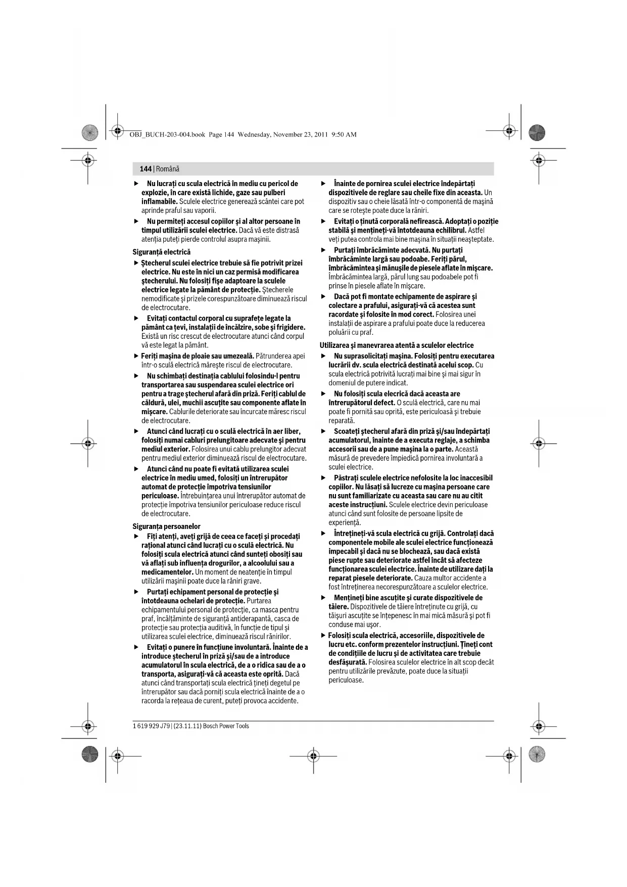 Cursa dipozitivului de frezare după şablon de copiere mm 50 58 Greutate conform EPTA-Procedure 01/2003 kg 3,5 4,8 Clasa de protecţie /II /II Specificaţiile sunt valabile pentru o tensiune nominală [U] de 230 V. În cazul unor tensiuni diferite şi al unor modele de execuţie specifice anumitor ţări, aceste speificaţii pot varia. Vă rugăm să reţineţi numărul de identificare de pe plăcuţa indicatoare a tipului sculei dumneavoastră electrice. Denumirile comerciale ale sculelor electrice pot varia. OBJ_BUCH-203-004.book Page 146 Wednesday, November 23, 2011 9:50 AMRomână | 147 Bosch Power Tools 1 619 929 J79 | (23.11.11) Declaraţie de conformitate Declarăm pe proprie răspundere că produsul descris la paragraful „Date tehnice“ este în conformitate cu următoarele standarde şi documente normative: EN 60745 conform prevederilor Directivelor 2011/65/UE, 2004/108/CE, 2006/42/CE. Documentaţie tehnică (2006/42/CE) la: Robert Bosch GmbH, PT/ETM9, D-70745 Leinfelden-Echterdingen Robert Bosch GmbH, Power Tools Division D-70745 Leinfelden-Echterdingen