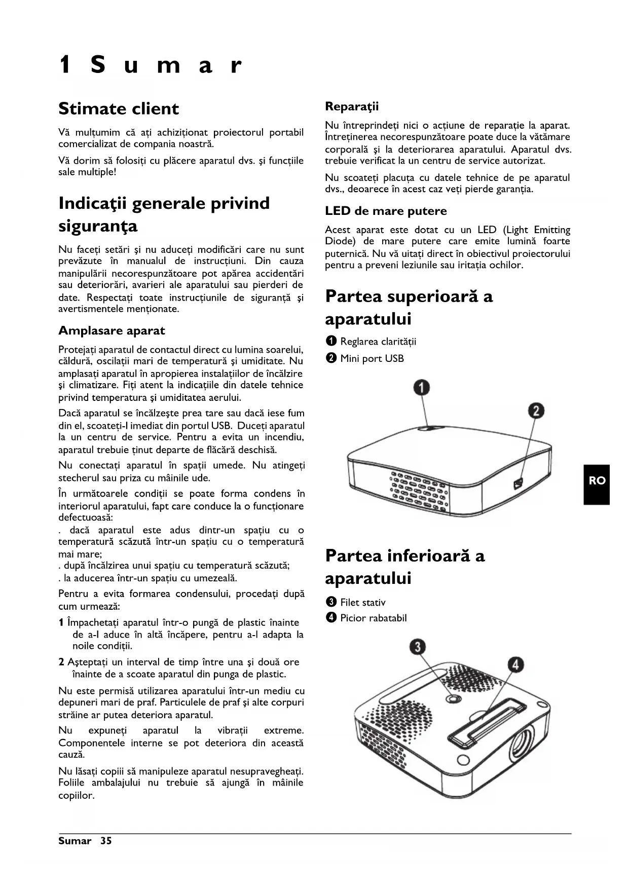 1Sumar Stimate client Vă mulţumim că aţi achiziţionat proiectorul portabil comercializat de compania noastră. Vă dorim să folosiţi cu plăcere aparatul dvs. şi funcţiile sale multiple! Indicaţii generale privind siguranţa Introducere 2 Nu faceţi setări şi nu aduceţi modificări care nu sunt prevăzute în manualul de instrucţiuni. Din cauza manipulării necorespunzătoare pot apărea accidentări sau deteriorări, avarieri ale aparatului sau pierderi de date. Respectaţi toate instrucţiunile de siguranţă şi avertismentele menţionate. Amplasare aparat Protejaţi aparatul de contactul direct cu lumina soarelui Protejaţi aparatul de contactul direct cu lumina soarelui, căldură, oscilaţii mari de temperatură şi umiditate. Nu amplasaţi aparatul în apropierea instalaţiilor de încălzire şi climatizare. Fiţi atent la indicaţiile din datele tehnice privind temperatura şi umiditatea aerului. Dacă aparatul se încălzeşte prea tare sau dacă iese fum din el (USB) Dacă aparatul se încălzeşte prea tare sau dacă iese fum din el, scoateţi-l imediat din portul USB. Duceţi aparatul la un centru de service. Pentru a evita un incendiu, aparatul trebuie ţinut departe de flăcără deschisă. Nu conectaţi a paratul în spaţii umede. Nu conectaţi aparatul în spaţii umede. Nu atingeţi stecherul sau priza cu mâinile ude. Condensul În următoarele condiţii se poate forma condens în interiorul aparatului, fapt care conduce la o funcţionare defectuoasă: . dacă aparatul este adus dintr-un spaţiu cu o temperatură scăzută într-un spaţiu cu o temperatură mai mare; . după încălzirea unui spaţiu cu temperatură scăzută; . la aducerea într-un spaţiu cu umezeală. Pentru a evita formarea condensului, procedaţi după cum urmează: 1 Împachetaţi aparatul într-o pungă de plastic înainte de a-l aduce în altă încăpere, pentru a-l adapta la noile condiţii. 2 Aşteptaţi un interval de timp între una şi două ore înainte de a scoate aparatul din punga de plastic. Nu este permisă utilizarea aparatului într-un mediu cu depuneri mari de praf. Nu este permisă utilizarea aparatului într-un mediu cu depuneri mari de praf. Particulele de praf şi alte corpuri străine ar putea deteriora aparatul. Nu expuneţi apar atul la vibraţii extreme. Nu expuneţi aparatul la vibraţii extreme. Componentele interne se pot deteriora din această cauză. Nu lăsaţi copiii să manipuleze aparatul nesupravegheaţi. Nu lăsaţi copiii să manipuleze aparatul nesupravegheaţi. Foliile ambalajului nu trebuie să ajungă în mâinile copiilor. Reparaţii Reparaţii Nu întreprindeţi nici o acţiune de reparaţie la aparat. Întreţinerea necorespunzătoare poate duce la vătămare corporală şi la deteriorarea aparatului. Aparatul dvs. trebuie verificat la un centru de service autorizat. Nu scoateţi placuţa cu datele tehnice de pe aparatul dvs., deoarece în acest caz veţi pierde garanţia. LED de mare putere Acest aparat este dotat cu un LED (Light Emitting Diode) de mare putere care emite lumină foarte puternică. Nu vă uitaţi direct în obiectivul proiectorului pentru a preveni leziunile sau iritaţia ochilor. Partea superioară a aparatului ‚ Reglarea clarităţii ƒ Mini port USB PicoPix P1 oben Partea inferioară a aparatului „ Filet stativ … Picior rabatabil PicoPix P1 unten ppx1020_manual_12_ro_253345797-b.book Seite 35 Freitag, 17. September 2010 12:11 1236 Philips · PPX1020
