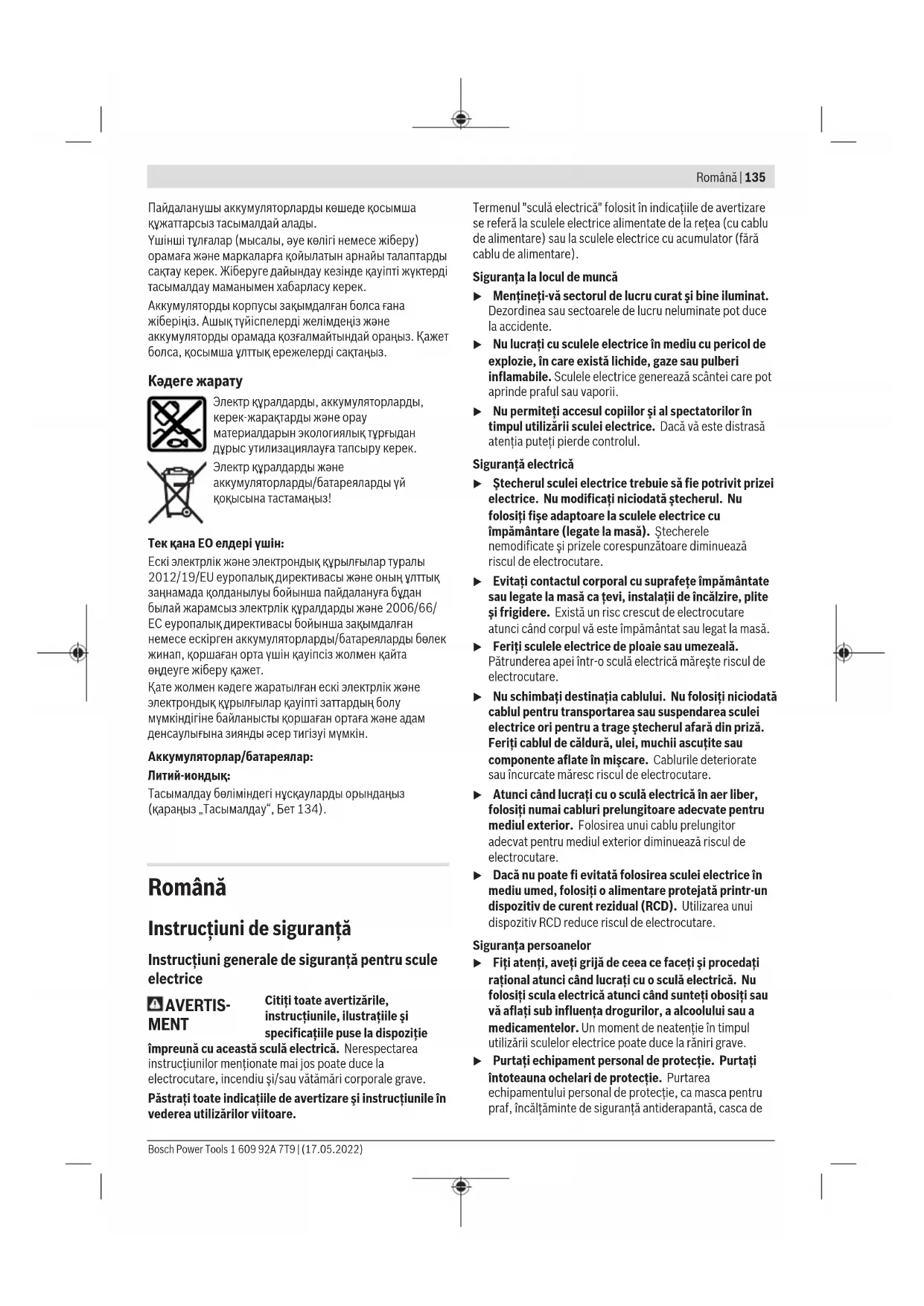 Ұсынылған литий-иондық аккумуляторлар қауіпті тауарларға қойылатын талаптарға бағынады. 1 609 92A 7T9 | (17.05.2022) Bosch Power ToolsRomână | 135 Пайдаланушы аккумуляторларды көшеде қосымша құжаттарсыз тасымалдай алады. Үшінші тұлғалар (мысалы, әуе көлігі немесе жіберу) орамаға және маркаларға қойылатын арнайы талаптарды сақтау керек. Жіберуге дайындау кезінде қауіпті жүктерді тасымалдау маманымен хабарласу керек. Аккумуляторды корпусы зақымдалған болса ғана жіберіңіз. Ашық түйіспелерді желімдеңіз және аккумуляторды орамада қозғалмайтындай ораңыз. Қажет болса, қосымша ұлттық ережелерді сақтаңыз. Кәдеге жарату Электр құралдарды, аккумуляторларды, керек-жарақтарды және орау материалдарын экологиялық тұрғыдан дұрыс утилизациялауға тапсыру керек. Электр құралдарды және аккумуляторларды/батареяларды үй қоқысына тастамаңыз! Тек қана ЕО елдері үшін: Ескі электрлік және электрондық құрылғылар туралы 2012/19/EU еуропалық директивасы және оның ұлттық заңнамада қолданылуы бойынша пайдалануға бұдан былай жарамсыз электрлік құралдарды және 2006/66/ ЕC еуропалық директивасы бойынша зақымдалған немесе ескірген аккумуляторларды/батареяларды бөлек жинап, қоршаған орта үшін қауіпсіз жолмен қайта өңдеуге жіберу қажет. Қате жолмен кәдеге жаратылған ескі электрлік және электрондық құрылғылар қауіпті заттардың болу мүмкіндігіне байланысты қоршаған ортаға және адам денсаулығына зиянды әсер тигізуі мүмкін. Аккумуляторлар/батареялар: Литий-иондық: Тасымалдау бөліміндегі нұсқауларды орындаңыз (қараңыз „Тасымалдау“, Бет134). Română Instrucţiuni de siguranţă Instrucţiuni generale de siguranţă pentru scule electrice AVERTIS- MENT Citiţi toate avertizările, instrucţiunile, ilustraţiile şi specificaţiile puse la dispoziţie împreună cu această sculă electrică. Nerespectarea instrucţiunilor menţionate mai jos poate duce la electrocutare, incendiu şi/sau vătămări corporale grave. Păstraţi toate indicaţiile de avertizare şi instrucţiunile în vederea utilizărilor viitoare. Termenul "sculă electrică" folosit în indicaţiile de avertizare se referă la sculele electrice alimentate de la reţea (cu cablu de alimentare) sau la sculele electrice cu acumulator (fără cablu de alimentare). Siguranţa la locul de muncă u Menţineţi‑vă sectorul de lucru curat şi bine iluminat. Dezordinea sau sectoarele de lucru neluminate pot duce la accidente. u Nu lucraţi cu sculele electrice în mediu cu pericol de explozie, în care există lichide, gaze sau pulberi inflamabile. Sculele electrice generează scântei care pot aprinde praful sau vaporii. u Nu permiteţi accesul copiilor şi al spectatorilor în timpul utilizării sculei electrice. Dacă vă este distrasă atenţia puteţi pierde controlul. Siguranţă electrică u Ştecherul sculei electrice trebuie să fie potrivit prizei electrice. Nu modificaţi niciodată ştecherul. Nu folosiţi fişe adaptoare la sculele electrice cu împământare (legate la masă). Ştecherele nemodificate şi prizele corespunzătoare diminuează riscul de electrocutare. u Evitaţi contactul corporal cu suprafeţe împământate sau legate la masă ca ţevi, instalaţii de încălzire, plite şi frigidere. Există un risc crescut de electrocutare atunci când corpul vă este împământat sau legat la masă. u Feriţi sculele electrice de ploaie sau umezeală. Pătrunderea apei într‑o sculă electrică măreşte riscul de electrocutare. u Nu schimbaţi destinaţia cablului. Nu folosiţi niciodată cablul pentru transportarea sau suspendarea sculei electrice ori pentru a trage ştecherul afară din priză. Feriţi cablul de căldură, ulei, muchii ascuţite sau componente aflate în mişcare. Cablurile deteriorate sau încurcate măresc riscul de electrocutare. u Atunci când lucraţi cu o sculă electrică în aer liber, folosiţi numai cabluri prelungitoare adecvate pentru mediul exterior. Folosirea unui cablu prelungitor adecvat pentru mediul exterior diminuează riscul de electrocutare. u Dacă nu poate fi evitată folosirea sculei electrice în mediu umed, folosiţi o alimentare protejată printr-un dispozitiv de curent rezidual (RCD). Utilizarea unui dispozitiv RCD reduce riscul de electrocutare. Siguranţa persoanelor u Fiţi atenţi, aveţi grijă de ceea ce faceţi şi procedaţi raţional atunci când lucraţi cu o sculă electrică. Nu folosiţi scula electrică atunci când sunteţi obosiţi sau vă aflaţi sub influenţa drogurilor, a alcoolului sau a medicamentelor. Un moment de neatenţie în timpul utilizării sculelor electrice poate duce la răniri grave. u Purtaţi echipament personal de protecţie. Purtaţi întoteauna ochelari de protecţie. Purtarea echipamentului personal de protecţie, ca masca pentru p