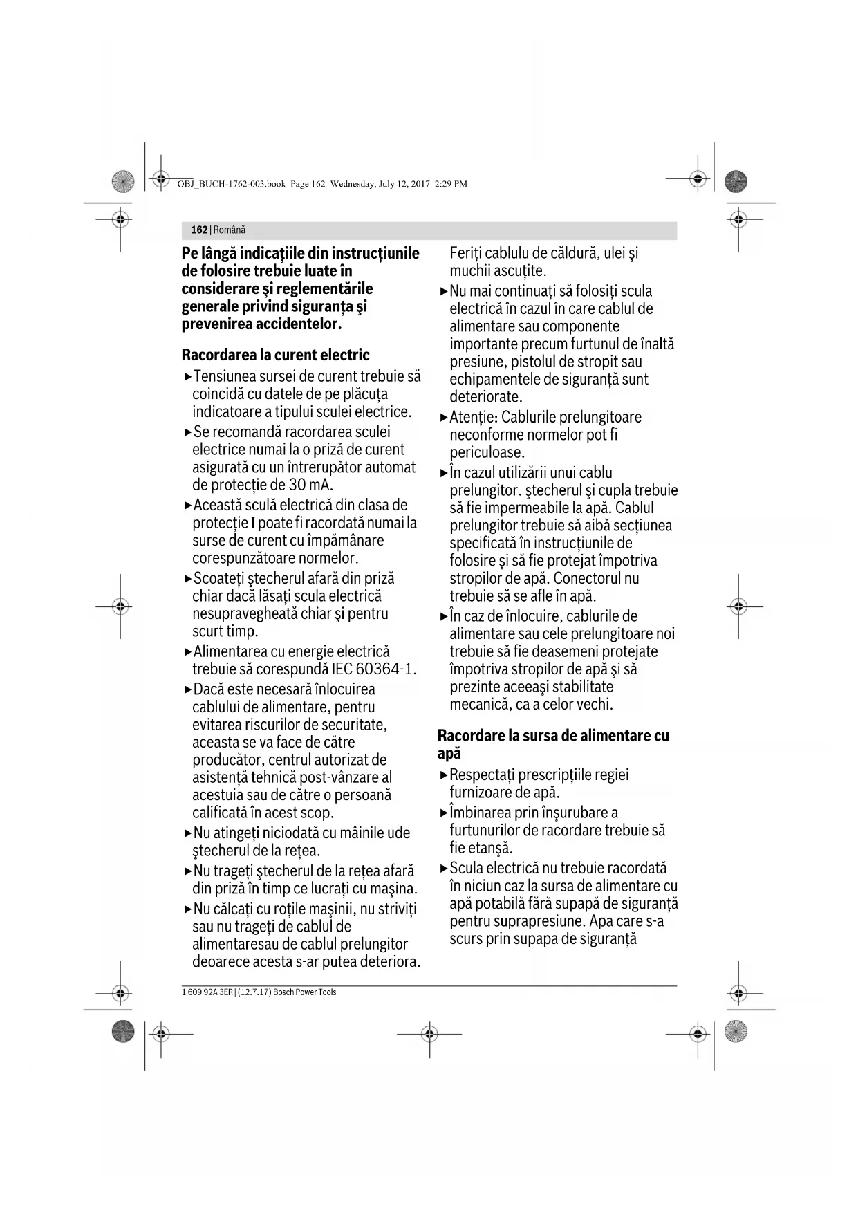 Можливі зміни. Română Instrucţiuni privind siguranţa şi protecţia muncii Explicarea pictogramelor Indicaţie generală de avertizare a periculozităţii. Nu îndreptaţi jetul de apă asupra oamenilor, animalelor, asupra maşinii sau componentelor electrice. Atenţie: jetul cu înaltă presiune poate fi periculos, atunci când este utilizat în mod greşit. Conform normelor în vigoare, scula electrică nu poate fi racordată fără un separator de sistem la reţeaua de apă potabilă. Folosiţi un separator de sistem conform IEC 61770 tip BA. Apa care curge prin speratorul de sistem este considerată ca fiind nepotabilă. Pentru aspirarea automată folosiţi un set de aspirare lung de 3 m (F 016 800 335). Instrucţiuni de siuranţă pentru maşini de curăţat cu înaltă presiune Citiţi toate indicaţiile de avertizare şi instrucţiunile. Nerespectarea indicaţiilor de avertizare şi a instrucţiunilor poate provoca electrocutare, incendii şi/sau răniri grave. Plăcuţele de avertizare şi cele indicatoare de pe maşină furnizează indicaţii importante pentru utilizarea sigură a acesteia. OBJ_BUCH-1762-003.book Page 161 Wednesday, July 12, 2017 2:29 PM162 | Română 1 609 92A 3ER | (12.7.17) Bosch Power Tools Pe lângă indicaţiile din instrucţiunile de folosire trebuie luate în considerare şi reglementările generale privind siguranţa şi prevenirea accidentelor. Racordarea la curent electric Tensiunea sursei de curent trebuie să coincidă cu datele de pe plăcuţa indicatoare a tipului sculei electrice. Se recomandă racordarea sculei electrice numai la o priză de curent asigurată cu un întrerupător automat de protecţie de 30 mA. Această sculă electrică din clasa de protecţie I poate fi racordată numai la surse de curent cu împămânare corespunzătoare normelor. Scoateţi ştecherul afară din priză chiar dacă lăsaţi scula electrică nesupravegheată chiar şi pentru scurt timp. Alimentarea cu energie electrică trebuie să corespundă IEC 60364-1. Dacă este necesară înlocuirea cablului de alimentare, pentru evitarea riscurilor de securitate, aceasta se va face de către producător, centrul autorizat de asistenţă tehnică post-vânzare al acestuia sau de către o persoană calificată în acest scop. Nu atingeţi niciodată cu mâinile ude ştecherul de la reţea. Nu trageţi ştecherul de la reţea afară din priză în timp ce lucraţi cu maşina. Nu călcaţi cu roţile maşinii, nu striviţi sau nu trageţi de cablul de alimentaresau de cablul prelungitor deoarece acesta s-ar putea deteriora. Feriţi cablulu de căldură, ulei şi muchii ascuţite. Nu mai continuaţi să folosiţi scula electrică în cazul în care cablul de alimentare sau componente importante precum furtunul de înaltă presiune, pistolul de stropit sau echipamentele de siguranţă sunt deteriorate. Atenţie: Cablurile prelungitoare neconforme normelor pot fi periculoase. În cazul utilizării unui cablu prelungitor. ştecherul şi cupla trebuie să fie impermeabile la apă. Cablul prelungitor trebuie să aibă secţiunea specificată în instrucţiunile de folosire şi să fie protejat împotriva stropilor de apă. Conectorul nu trebuie să se afle în apă. În caz de înlocuire, cablurile de alimentare sau cele prelungitoare noi trebuie să fie deasemeni protejate împotriva stropilor de apă şi să prezinte aceeaşi stabilitate mecanică, ca a celor vechi. Racordare la sursa de alimentare cu apă Respectaţi prescripţiile regiei furnizoare de apă. Îmbinarea prin înşurubare a furtunurilor de racordare trebuie să fie etanşă. Scula electrică nu trebuie racordată în niciun caz la sursa de alimentare cu apă potabilă fără supapă de siguranţă pentru suprapresiune. Apa care s-a scurs prin supapa de siguranţă OBJ_BUCH-1762-003.book Page 162 Wednesday, July 12, 2017 2:29 PMRomână | 163 Bosch Power Tools 1 609 92A 3ER | (12.7.17) pentru suprapresiune nu mai este potabilă. Furtunul de înaltă presiune nu trebuie să fie deteriorat (pericol de explozie). Un furtun de înaltă presiune deteriorat trebuie schimbat neîntârziat. În acest scop se vor folosi numai furtunuri şi racorduri recomandate de producător. Furtunurile de înaltă presiune, armăturile şi cuplajele sunt importante pentru siguranţa maşinii. Folosiţi numai furtunuri, armături şi cuplaje recomandate de producător. Pentru alimentare se va folosi numai apă curată sau filtrată. Utilizare Înainte de utilizare, maşina şi accesoriile trebuie controlate cu privire la starea lor corespunzătoare şi la siguranţa de funcţionare. În cazul în care starea acestora nu este impecabilă, nu este permisă utilizarea lor. Nu îndreptaţi jetul de apă asupra dumneavoastră sau asupra altor persoane, pentru curăţarea îmbrăcăminţii sau a încălţămintei. Nu este permisă aspirarea de lichide care conţin solvenţi, de acizi nediluaţi, de acetonă sau solvenţi inclusiv benzină, de diluanţi pentru vopsele şi de păcură, deoarece dispersiile de pulverizare ale acestora sunt foarte inflamabile, explozibile şi toxice. În cazul utilizării maşinilor în zone periculoase (de ex. staţii de benzină) trebuie respectate aceleaşi prescripţii privind siguranţa. Este interzisă exploatarea în spaţii cu pericol de explozie. Maşina trebuie aşezată pe o suprafaţă stabilă. În cazul utilizării în spaţii închise aveţi grijă să aerisiţi corespunzător. Asiguraţi-vă că vehiculele sunt oprite (motorul oprit) în timpul curăţării lor. Pentru manevrarea maşinii de curăţat cu înaltă presiune sunt necesare ambele mâini. De aceea, nu lucraţi fiind suiţi pe o scară. Atunci când lucraţi pe balcoane sau pe alte suprafeţe proeminente, asiguraţi-vă că vedeţi în orice moment toate marginile acestora. Folosiţi numai detergenţii recomandaţi de producătorul maşinii şi respectaţi indicaţiile sale de utilizare, eliminare şi avertizare. Toate co