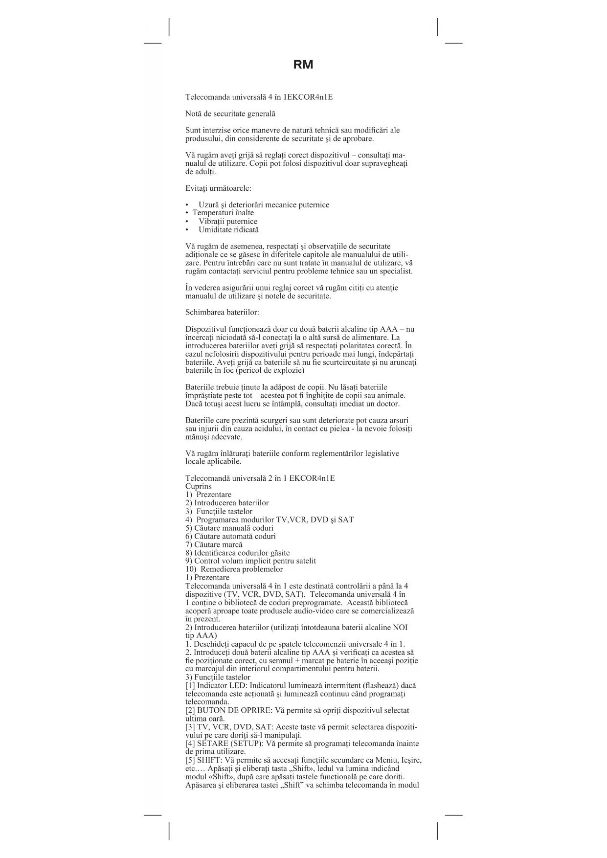 Telecomandauniversală4în1estedestinatăcontrolăriiapânăla4 dispozitive(TV,VCR,DVD,SAT).Telecomandauniversală4în 1conţineobibliotecădecoduripreprogramate.Aceastăbibliotecă acoperăaproapetoateproduseleaudio-videocaresecomercializează în prezent. 2)Introducereabateriilor(utilizaţiîntotdeaunabateriialcalineNOI tip AAA) 1.Deschideţicapaculdepespateletelecomenziiuniversale4în1. 2.IntroduceţidouăbateriialcalinetipAAAşivericaţicaacesteasă epoziţionatecorect,cusemnul+marcatpebaterieînaceeaşipoziţie cu marcajul din interiorul compartimentului pentru baterii. 3)Funcţiiletastelor [1]IndicatorLED:Indicatorullumineazăintermitent(ashează)dacă telecomandaesteacţionatăşilumineazăcontinuucândprogramaţi telecomanda. [2]BUTONDEOPRIRE:Văpermitesăopriţidispozitivulselectat ultimaoară. [3]TV,VCR,DVD,SAT:Acestetastevăpermitselectareadispoziti- vuluipecaredoriţisă-lmanipulaţi. [4]SETARE(SETUP):Văpermitesăprogramaţitelecomandaînainte de prima utilizare. [5]SHIFT:VăpermitesăaccesaţifuncţiilesecundarecaMeniu,Ieşire, etc.…Apăsaţişieliberaţitasta„Shift»,ledulvaluminaindicând modul«Shift»,dupăcareapăsaţitastelefuncţionalăpecaredoriţi. Apăsareaşieliberareatastei„Shift”vaschimbatelecomandaînmodul RMnormaldeoperare.Dacănuseapasăniciotastădupă„Shift”,teleco- mandavareveniînmoddefuncţionarenormal(non-shift)după15-20 secunde. [6]INFO:Aşeazăinformaţiidespreaparatulselectat. [7]PROG+/-: Modurile TV, VCR sau SAT: selectare canale anterioare sau următoare. ModDVD:selectarecapitoleanterioaresauurmătoare. SHIFT+PROG+/-:tastedenavigaremeniu,văpermitsănavigaţi însusşiînjosînmeniuriledispozitivelorDv. [8]Volume+/-:Văpermitesămanipulaţisonorul.Aveţiposibilitatea sămanipulaţisonorultelevizoruluichiarşiînmodurileVCR,DVD, sauSAT.NuestenevoiesăselectaţimodulTV. SHIFT+PROG+/-:tastedenavigaremeniu,văpermitsănavigaţi lastângaşiladreaptaînmeniuriledispozitivelorDv. [9]TeletextMIX:Văpermitesăsuprapuneţiimagineaşiteletextul canalului selectat. [10]Mute:Văpermitesăporniţi/opriţisonorul.Aveţiposibilitateasă manipulaţifuncţia„Mute”atelevizoruluichiarşiînmodurileVCR, DVD,sauSAT.NuestenevoiesăselectaţimodulTV. SHIFT+Mute:TastaOK,conrmăselecţia. [11] Teletext OFF: Mod TV: Oprire Teletext. SHIFT+TeletextOFF:Ieşiredinmeniu. [12]TeletextHold:Oprireaschimbăriipaginiiînmodulteletext. [13] Taste numerice 0 – 9: Se folosesc la fel ca la telecomenzile originale. [14] Teletext ON: ModTV:Pornire/oprireteletext. SHIFT+TeletextON:Activaremeniu. [15]ENT:Înmoduldeprogramare–căutareautomatăcoduri–puteţi conrmacoduldispozitivuluipecaredoriţisă-lcontrolaţi.Încazul unorechipamente,împreunăcutastelenumerice,acestbutonvădă posibilitateaselectăriidirecteacanalelornumerotatecunumerepeste
