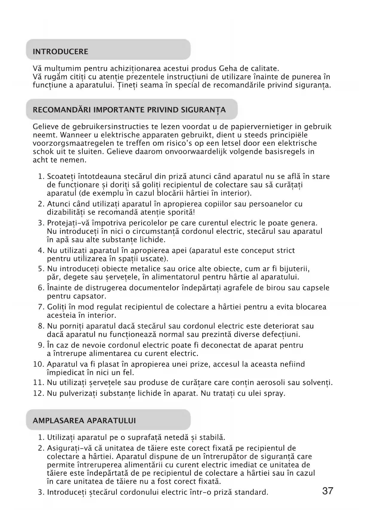 Vä rugam cititi cu atentie prezentele instructiuni de utilizare inainte de punerea in functiune a aparatului. Tiniţi seama in special de recomandările privind siguranta.