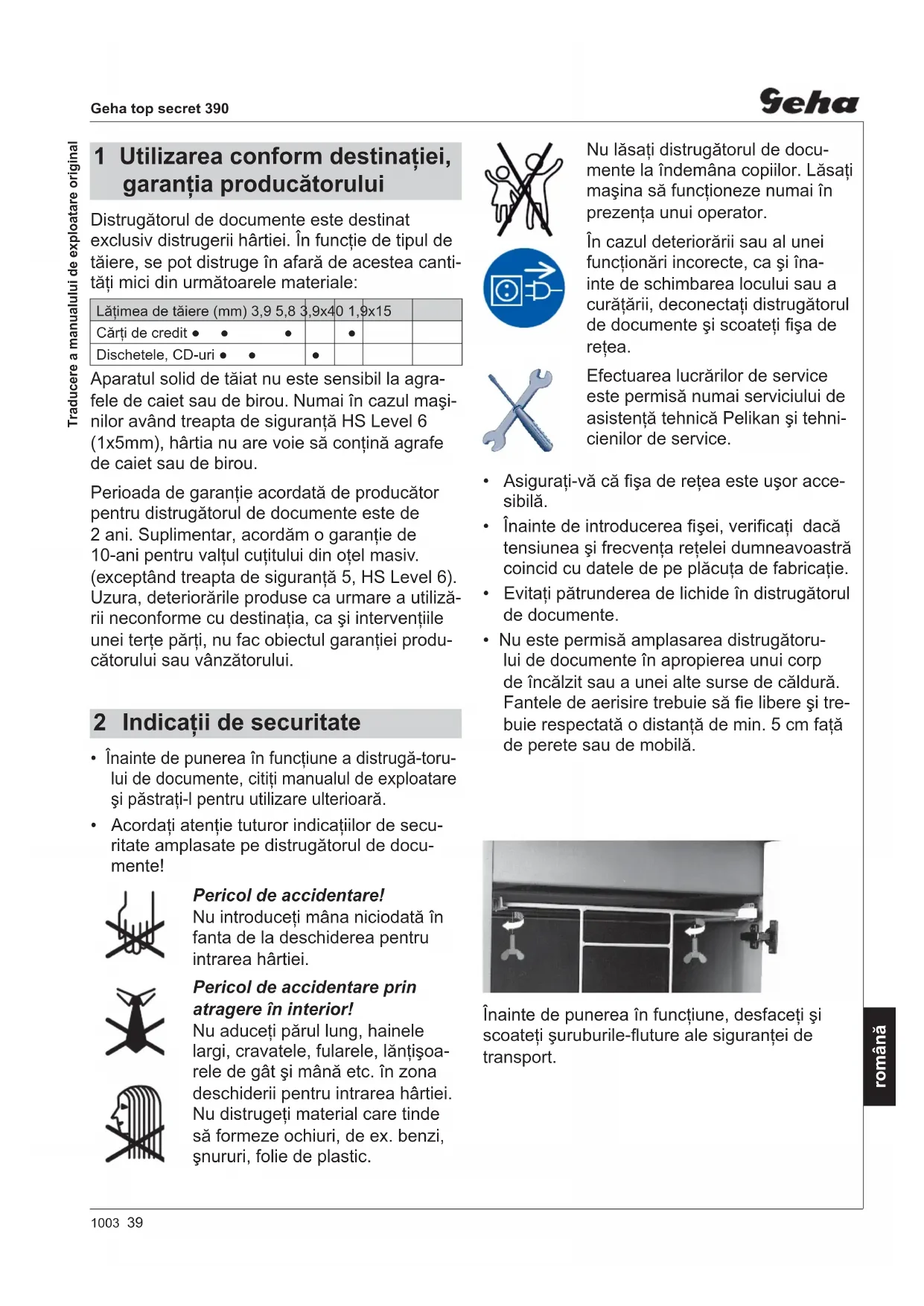 - Acordaţi atenţie tuturor indicaţiilor de secu- ritate amplasate pe distrugătorul de docu- mente! Pericol de accidentare! Nu introduceţi mâna niciodată în fanta de la deschiderea pentru intrarea hârtiei. Pericol de accidentare prin atragere în interior! Nu aduceţi părul lung, hainele largi, cravatele, fularele, lănţişoa- rele de gât şi mână etc. în zona deschiderii pentru intrarea hârtiei. Nu distrugeţi material care tinde să formeze ochiuri, de ex. benzi, şnururi, folie de plastic. 2 Indicaţii de securitate40 1003Geha top secret 390 română Pornirea distrugătorului de documente