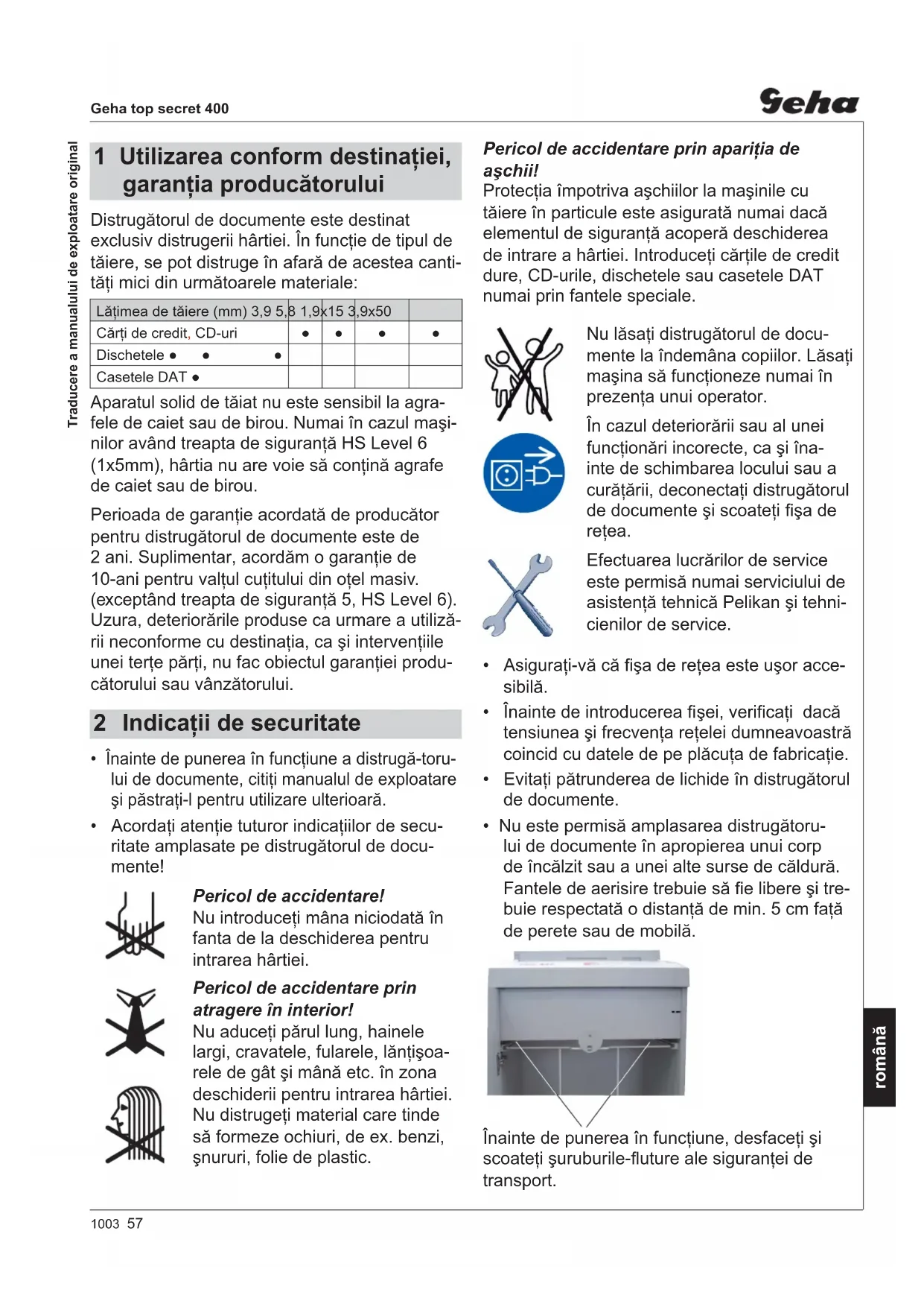 - EN 60950-1:20061003 57 Geha top secret 400 română Distrugătorul de documente este destinat exclusiv distrugerii hârtiei. În funcţie de tipul de tăiere, se pot distruge în afară de acestea canti- tăţi mici din următoarele materiale: Lăţimea de tăiere (mm) 3,9 5,8 1,9x15 3,9x50 Cărţi de credit, CD-uri ●● ● ● Dischetele ●● ● Casetele DAT ● Aparatul solid de tăiat nu este sensibil la agra- fele de caiet sau de birou. Numai în cazul maşi- nilor având treapta de siguranţă HS Level 6 (1x5mm), hârtia nu are voie să conţină agrafe de caiet sau de birou. Perioada de garanţie acordată de producător pentru distrugătorul de documente este de 2 ani. Suplimentar, acordăm o garanţie de 10-ani pentru valţul cuţitului din oţel masiv.