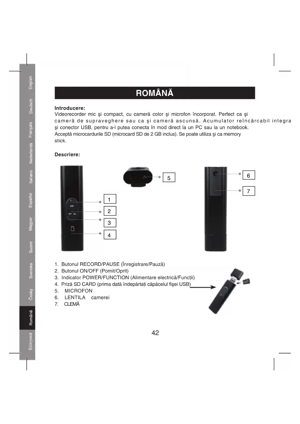 DVRCAM10 într-un port USB liber al unui PC sau al unui notebook. PC-ul sau notebook-ul va recunoaşte dispozitivul SEC-DVRCAM10 ca şi pe un disc amovibil. Deschideţi mapa pen tru a vizualiza înregistrările făcute. Observaţie: Observaţie: pentru redare 3GP, descărcaţi playerul gratuit: www.apple.com/quicktime/download/ Dacă bateria este în curs de descărcare, indicatorul POWER/FUNCTION (Alimentare electrică/Funcţii) (3) va pâlpâi cu lumină roşie. Înregistrarea în curs va fi salvată înainte de oprirea dispozitivului SEC-DVRCAM10. Specificaţii tehnice: