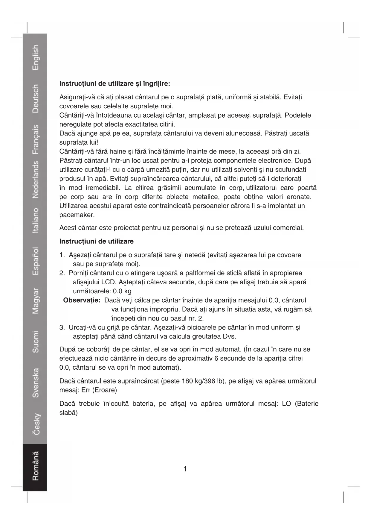 Păstrați càntarul intr-un loc uscat pentru a-i proteja componentele electronice. Dupăutilizare curăța-i cu o càrpă umezită puțin, dar nu utilizati solventiși nu scufundați produsul in apă. Evitați supraíncărarea càntarului, că altfel puteti să-l deterioratoriți in mod iremediabil. La citirea grăsimii acumulate in corp, utilizatorul care poartăpe corp sau are in corp diferite obiecte metalice, poate obtine valori eronate. Utilizarea acestui aparat este contraindicata personelor carora li s-a implantat un pacemaker.