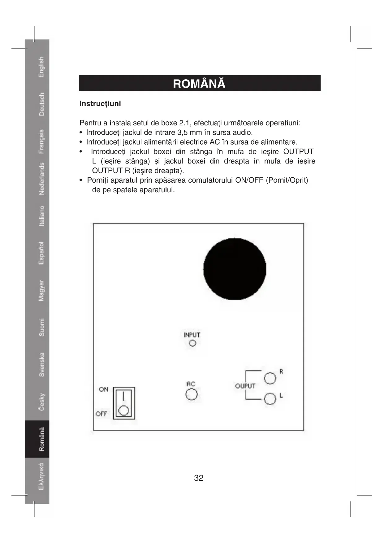 - Introduceţi jackul boxei din stânga în mufa de ieşire OUTPUT L (ieşire stânga) şi jackul boxei din dreapta în mufa de ieşire OUTPUT R (ieşire dreapta).