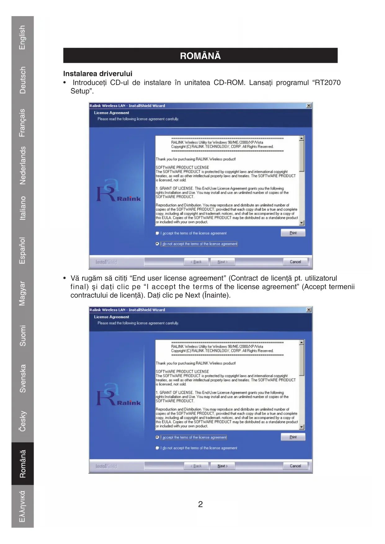 - Introduci CD-ul de instalare in unitatea CD-ROM. Lansa programul "RT2070 Setup".