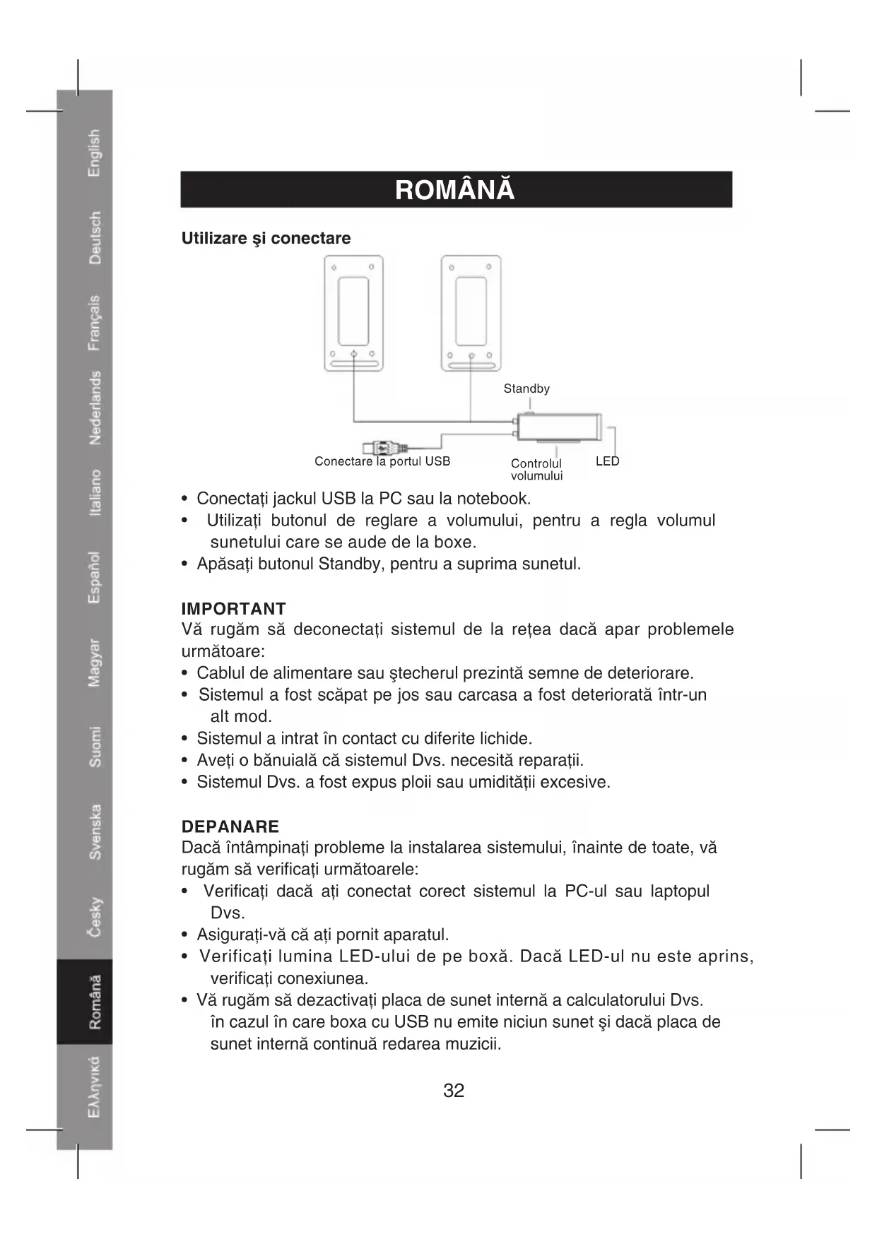 - Apăsaţi butonul Standby, pentru a suprima sunetul. IMPORTANT Vă rugăm să deconectaţi sistemul de la reţea dacă apar problemele următoare: