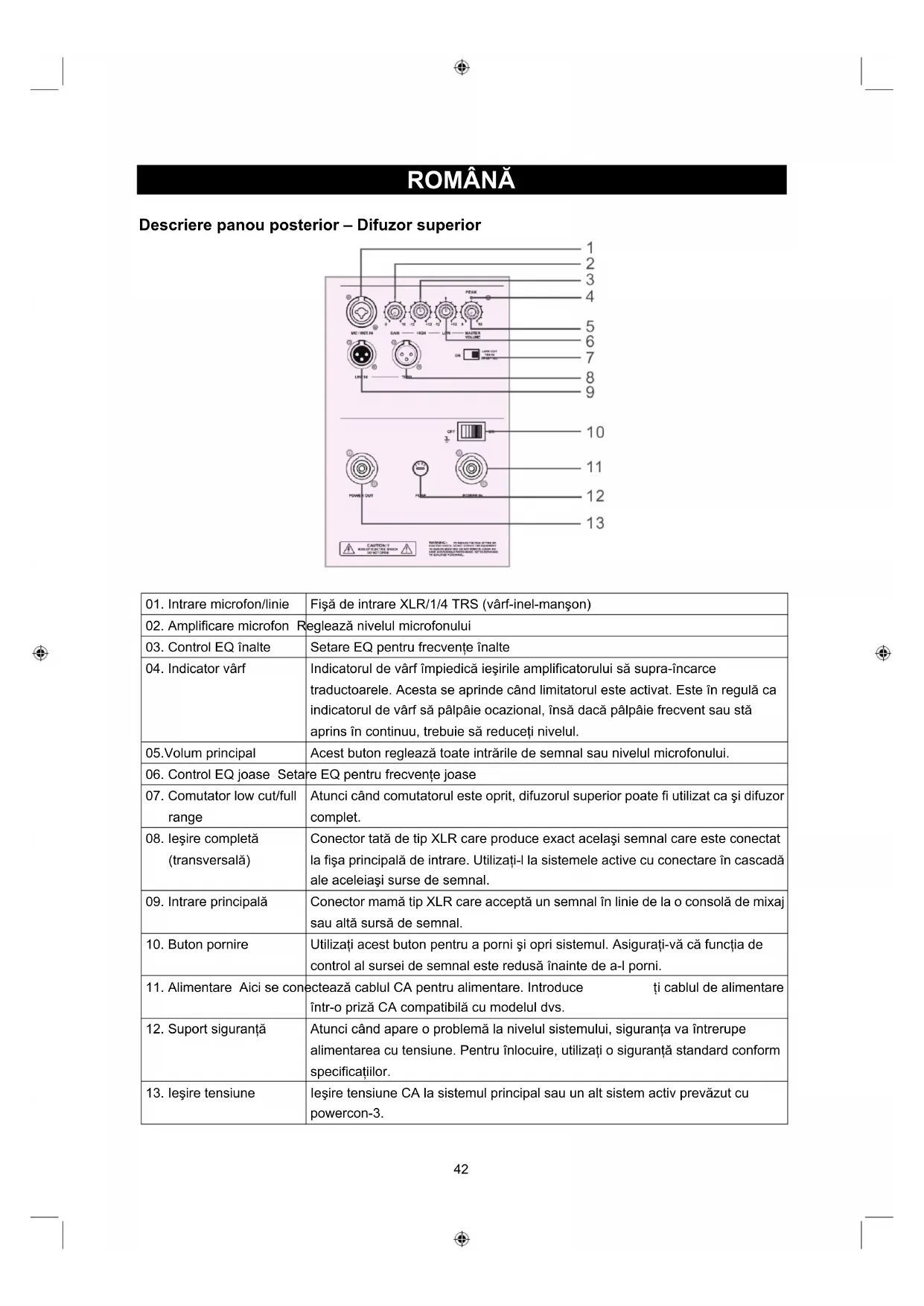 09. Intrare principală Conector mamă tip XLR care acceptă un semnal în linie de la o consolă de mixaj