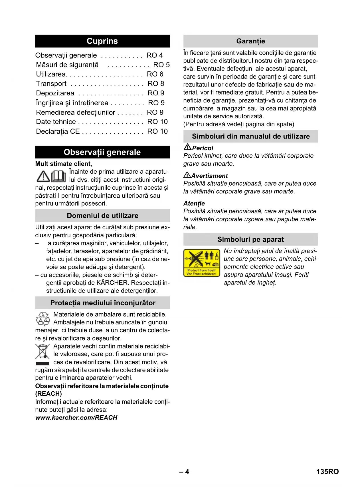 89 dB(A) 133PL– 11 Niniejszym oświadczamy, że określone poniżej urządzenie odpowiada pod względem koncepcji, konstrukcji oraz wprowadzonej przez nas do handlu wersji obowiązującym wymogom dyrek- tyw UE dotyczącym wymagań w zakresie bez- pieczeństwa i zdrowia. Wszelkie nie uzgodnione z nami modyfikacje urządzenia powodują utratę ważności tego oświadczenia. Z upoważnienia zarządu przedsiębiorstwa. Pełnomocnik dokumentacji: S. Reiser Alfred Kärcher GmbH & Co. KG Alfred-Kärcher-Str. 28 - 40 71364 Winnenden (Germany) tel.: +49 7195 14-0 faks: +49 7195 14-2212 Winnenden, 2012/01/01 Deklaracja zgodności UE Produkt: Myjka wysokociśnieniowa Typ: 1.674-xxx Obowiązujące dyrektywy WE 2006/42/WE (+2009/127/WE) 2004/108/WE 2000/14/WE Zastosowane normy zharmonizowane EN 55014–1: 2006 + A1: 2009 EN 55014–2: 1997 + A2: 2008 EN 60335–1 EN 60335–2–79 EN 61000–3–2: 2006 + A2: 2009 EN 61000–3–3: 2008 EN 62233: 2008 Zastosowana metoda oceny zgodności 2000/14/WE: Załącznik V Poziom mocy akustycznej dB(A) Zmierzony: 86 Gwarantowany: 89 CEO Head of Approbation 134 PL– 4 Mult stimate client, Înainte de prima utilizare a aparatu- lui dvs. citiţi acest instrucţiuni origi- nal, respectaţi instrucţiunile cuprinse în acesta şi păstraţi-l pentru întrebuinţarea ulterioară sau pentru următorii posesori. Utilizaţi acest aparat de curăţat sub presiune ex- clusiv pentru gospodăria particulară: – la curăţarea maşinilor, vehiculelor, utilajelor, faţadelor, teraselor, aparatelor de grădinărit, etc. cu jet de apă sub presiune (în caz de ne- voie se poate adăuga şi detergent). – cu accesoriile, piesele de schimb şi deter- genţii aprobaţi de KÄRCHER. Respectaţi in- strucţiunile de utilizare ale detergenţilor. Materialele de ambalare sunt reciclabile. Ambalajele nu trebuie aruncate în gunoiul menajer, ci trebuie duse la un centru de colecta- re şi revalorificare a deşeurilor. Aparatele vechi conţin materiale reciclabi- le valoroase, care pot fi supuse unui pro- ces de revalorificare. Din acest motiv, vă rugăm să apelaţi la centrele de colectare abilitate pentru eliminarea aparatelor vechi. Observaţii referitoare la materialele conţinute (REACH) Informaţii actuale referitoare la materialele conţi- nute puteţi găsi la adresa: www.kaercher.com/REACH În fiecare ţară sunt valabile condiţiile de garanţie publicate de distribuitorul nostru din ţara respec- tivă. Eventuale defecţiuni ale acestui aparat, care survin în perioada de garanţie şi care sunt rezultatul unor defecte de fabricaţie sau de ma- terial, vor fi remediate gratuit. Pentru a putea be- neficia de garanţie, prezentaţi-vă cu chitanţa de cumpărare la magazin sau la cea mai apropiată unitate de service autorizată. (Pentru adresă vedeţi pagina din spate) Pericol Pericol iminet, care duce la vătămări corporale grave sau moarte. 몇 Avertisment Posibilă situaţie periculoasă, care ar putea duce la vătămări corporale grave sau moarte. Atenţie Posibilă situaţie periculoasă, care ar putea duce la vătămări corporale uşoare sau pagube mate- riale. Nu îndreptaţi jetul de înaltă presi- une spre persoane, animale, echi- pamente electrice active sau asupra aparatului însuşi. Feriţi aparatul de îngheţ. Cuprins Observaţii generale . . . . . . . . . . . RO 4 Măsuri de siguranţă . . . . . . . . . . . RO 5 Utilizarea. . . . . . . . . . . . . . . . . . . . RO 6 Transport . . . . . . . . . . . . . . . . . . . RO 8 Depozitarea . . . . . . . . . . . . . . . . . RO 9 Îngrijirea şi întreţinerea . . . . . . . . . RO 9 Remedierea defecţiunilor . . . . . . . RO 9 Date tehnice . . . . . . . . . . . . . . . . . RO 10 Declaraţia CE . . . . . . . . . . . . . . . . RO 10 Observaţii generale Domeniul de utilizare Protecţia mediului înconjurător Garanţie Simboluri din manualul de utilizare Simboluri pe aparat 135RO– 5 Pericol Nu apucaţi niciodată fişa de alimentare şi pri- za având mâinile ude. Nu puneţi aparatul în funcţiune dacă este deteri- orat cablul de alimentare de la reţea sau elemen- te importante ale aparatului, precum de ex. furtunul de presiune, pistolul de pulverizare sau dispozitivele de siguranţă. Înainte de fiecare utilizare verificaţi cablul de re- ţea şi ştecherul, să nu aibă defecţiuni. Cablul de reţea deteriorat trebuie înlocuit neîntârziat într-un atelier electric / service pentru clienţi autorizat. Verificaţi furtunurile de presiune înainte de fieca- re utilizare. Înlocuiţi-le neîntârziat pe cele care prezintă defecţiuni. Este interzisă funcţionarea în zone cu pericol de explozie. La utilizarea aparatului în zone periculoase (de ex. recipiente de combustibil) se vor respecta in- strucţiunile de securitate corespunzătoare. Jeturile sub presiune pot fi periculoase în cazul utilizării neconforme. Jetul nu trebuie îndreptat spre persoane, animale, echipamente electrice active sau asupra aparatului însuşi. Nu îndreptaţi jetul de presiune spre dvs. înşivă sau spre altcineva, pentru a curăţa îmbrăcămin- tea sau încălţămintea. Nu stropiţi obiecte ce conţin materiale periculoa- se (de ex. azbest). Cauciucurile vehiculelor/ventilele lor pot fi deteri- orate de jetul sub presiune şi se pot fisura. Primul semn este o decolorare a cauciucului. Anvelope- le/supapele anvelopelor deteriorate pun în peri- col viaţa persoanelor. La curăţare păstraţi o distanţă minimă de cel puţin 30 cm ! Pericol de explozie! Nu pulverizaţi lichide inflamabile. Nu se vor aspira niciodată lichide conţinând sol- venţi, dizolvanţi sau acizi nediluaţi! În această ca- tegorie intră de ex. benzina, diluantul pentru vopsea, uleiul. Ceaţa formată la stropire este in- flamabilă, explozivă şi toxică. Nu folosiţi acetonă, acizi nediluaţi şi dizolvanţi, căci atacă materialele folosite la aparat. 몇 Avertisment Ştecherul şi cuplajul unui prelungitor trebuie să fie etanşe 