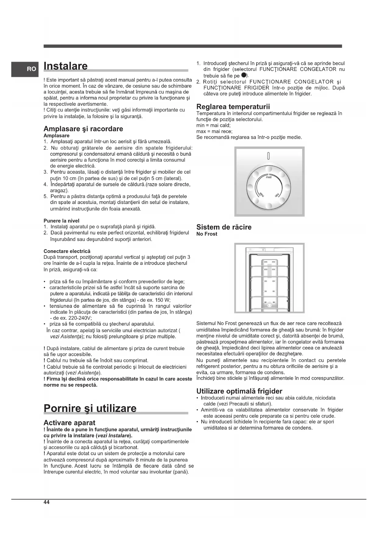 Acest aparat este conform cu următoarele Directive Comunitare:-73/23/CEE din data de 19/02/73 (Tensiuni Joase) şi modicări succesive; - 89/336/CEE din data de 03/05/89 (Compatibilitate Electromagnetică) şi modicări succesive;- 2002/96/CE. Siguranţa generală • Acest aparat de uz casnic fost conceput pentru a folosit numai în interiorul locuinţelor.• De aceea, trebuie să e utilizat numai pentru conservarea şi congelarea alimentelor şi numai de persoane adulte, conform instrucţiunilor din manual.• Aparatul nu trebuie instalat în aer liber, nici chiar în cazul în care spaţiul este adăpostit, deoarece expunerea acestuia la ploi şi furtuni este foarte periculoasă.• Nu atingeţi aparatul când sunteţi desculţi sau cu mâinile sau picioarele ude sau umede.• Nu atingeţi componentele de răcire din interiorul său: că puteţi arde sau răni.• Nu scoateţi ştecherul din priză trăgând de cablu.• Este necesar să scoateţi ştecherul din priză înainte de a efectua operaţiile de curăţire şi întreţinere. Nu este sucient să poziţionaţi selectorul pentru REGLAREA TEMPERATURII pe (aparat oprit) pentru a tăia alimentarea cu curent electric.• În caz de defecţiune, nu umblaţi în nici un caz la mecanismele interne şi nu încercaţi s-o reparaţi singuri.• Nu utilizaţi - în compartimentele de păstrare a alimentelor congelate – obiecte tăietoare sau ascuţite, sau aparate electrice, dacă nu au fost recomandate de fabricant.• Nu băgaţi în gură cuburile de gheaţă imediat după ce le-aţi scos din congelator. • Acest aparat nu este destinat utilizării de către persoane (inclusiv copii) cu capacitate zică, senzorială sau mentală redusă sau care nu au experienţă şi cunoştinţe cu excepţia cazurilor în care sunt supravegheate sau instruite în prealabil în privinţa utilizării aparatului de către o persoană responsabilă de siguranţa acestora. Copii trebuie supravegheaţi pentru a nu se juca cu aparatul.• Ambalajele nu sunt jucării pentru copii! Lichidare aparat • Lichidarea ambalajelor: respectaţi normele locale, în acest fel ambalajele vor putea utilizate din nou.• Lichidarea unui aparat vechi: RESPECTAŢI LEGISLAŢIA ÎN MATERIE DE LICHIDARE. Frigiderele şi congelatoarele conţin, în zona de răcire şi în izolaţie, gaz izobutan şi ciclopentan care, dacă sunt eliminate în atmosferă, sunt periculoase. EVITAŢI DECI DETERIORAREA TUBURILOR.• Înainte de a lichida aparatul vechi, tăiaţi cablul de alimentare cu curent electric şi îndepărtaţi balamalele, pentru a nu putea utilizat de altcineva. Atenţionări în conformitate cu legislaţia în