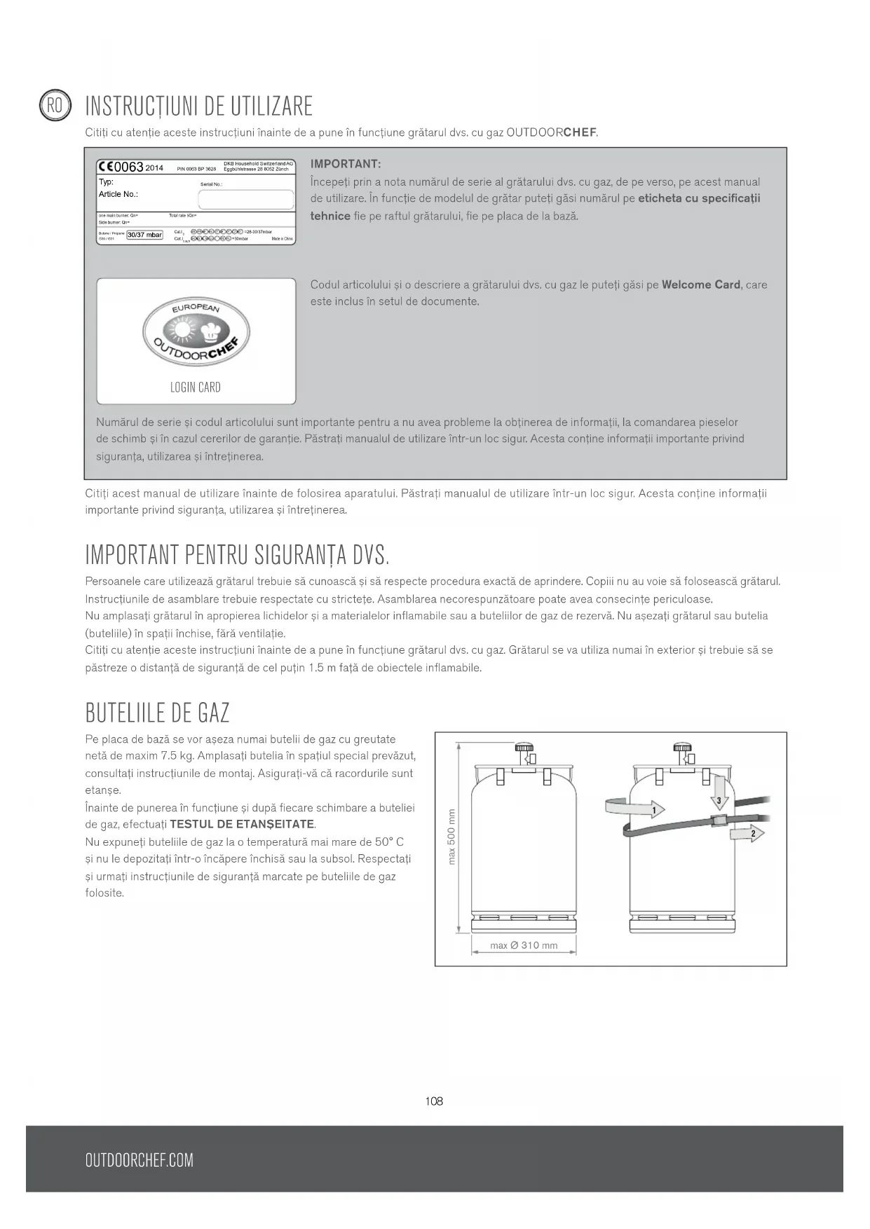 INSTRUCțIUNI DE UTILIzARE Citiți cu atenție aceste instrucțiuni înainte de a pune în funcțiune grătarul dvs. cu gaz OUTDOORCHEF. Citiți acest manual de utilizare înainte de folosirea aparatului. Păstrați manualul de utilizare într-un loc sigur. Acesta conține informații importante privind siguranța, utilizarea și întreținerea. IMPORTANT PENTRU SIGURANțA DvS. Persoanele care utilizează grătarul trebuie să cunoască și să respecte procedura exactă de aprindere. Copiii nu au voie să folosească grătarul. Instrucțiunile de asamblare trebuie respectate cu strictețe. Asamblarea necorespunzătoare poate avea consecințe periculoase. Nu amplasați grătarul în apropierea lichidelor și a materialelor inflamabile sau a buteliilor de gaz de rezervă. Nu așezați grătarul sau butelia (buteliile) în spații închise, fără ventilație. Citiți cu atenție aceste instrucțiuni înainte de a pune în funcțiune grătarul dvs. cu gaz. Grătarul se va utiliza numai în exterior și trebuie să se păstreze o distanță de siguranță de cel puțin 1.5 m față de obiectele inflamabile. BUTELIILE DE GAz Pe placa de bază se vor așeza numai butelii de gaz cu greutate netă de maxim 7.5 kg. Amplasați butelia în spațiul special prevăzut, consultați instrucțiunile de montaj. Asigurați-vă că racordurile sunt etanșe. Înainte de punerea în funcțiune și după fiecare schimbare a buteliei de gaz, efectuați TESTUL DE ETANȘEITATE. Nu expuneți buteliile de gaz la o temperatură mai mare de 50° C și nu le depozitați într-o încăpere închisă sau la subsol. Respectați și urmați instrucțiunile de siguranță marcate pe buteliile de gaz folosite. max 500 mm max Ø 310 mm