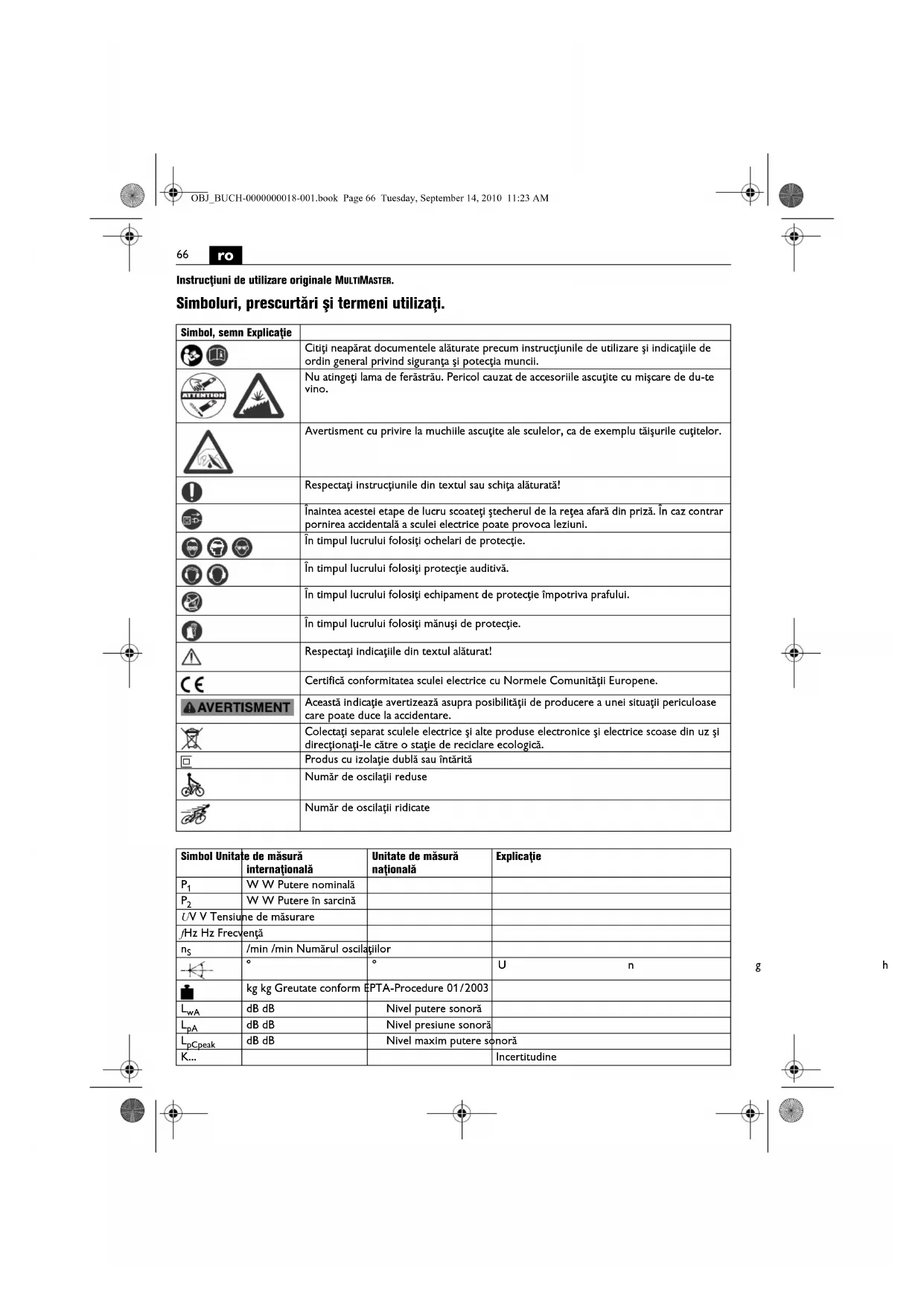 Instrucţiuni de utilizare originale MULTIMASTER. Simboluri, prescurtări şi termeni utilizaţi. Simbol, semn Explicaţie Citiţi neapărat documentele alăturate precum instrucţiunile de utilizare şi indicaţiile de ordin general privind siguranţa şi potecţia muncii. Nu atingeţi lama de ferăstrău. Pericol cauzat de accesoriile ascuţite cu mişcare de du-te vino. Avertisment cu privire la muchiile ascuţite ale sculelor, ca de exemplu tăişurile cuţitelor. Respectaţi instrucţiunile din textul sau schiţa alăturată! Înaintea acestei etape de lucru scoateţi ştecherul de la reţea afară din priză. În caz contrar pornirea accidentală a sculei electrice poate provoca leziuni. În timpul lucrului folosiţi ochelari de protecţie. În timpul lucrului folosiţi protecţie auditivă. În timpul lucrului folosiţi echipament de protecţie împotriva prafului. În timpul lucrului folosiţi mănuşi de protecţie. Respectaţi indicaţiile din textul alăturat! Certifică conformitatea sculei electrice cu Normele Comunităţii Europene. Această indicaţie avertizează asupra posibilităţii de producere a unei situaţii periculoase care poate duce la accidentare. Colectaţi separat sculele electrice şi alte produse electronice şi electrice scoase din uz şi direcţionaţi-le către o staţie de reciclare ecologică. Produs cu izolaţie dublă sau întărită Număr de oscilaţii reduse Număr de oscilaţii ridicate Simbol Unitate de măsură internaţională Unitate de măsură naţională Explicaţie