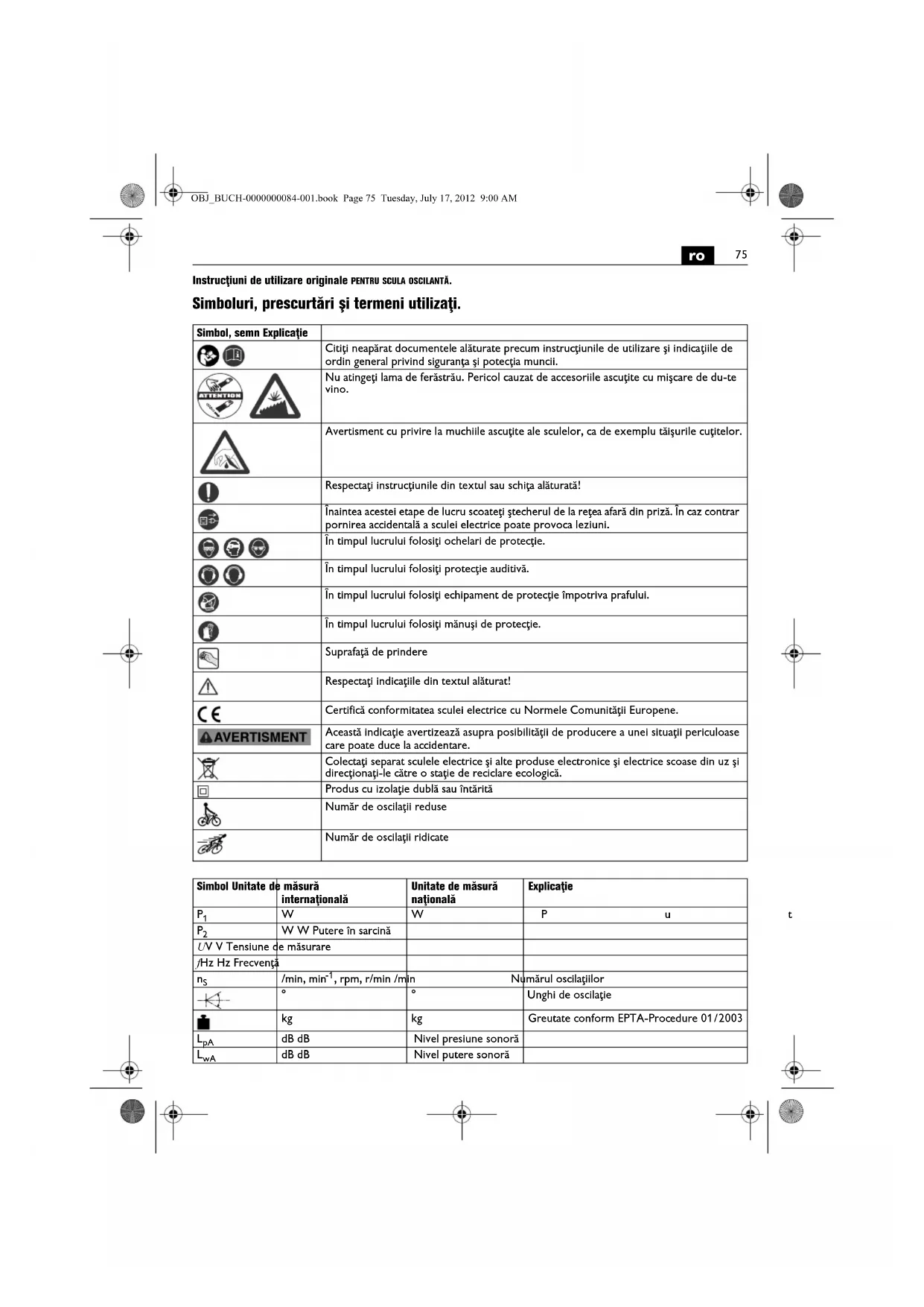 | m, s, kg, A, mm, V, W, Hz, N, °C, dB, min, m/s2 | m, s, kg, A, mm, V, W, Hz, N, °C, dB, min, m/s2 | Unități de măsură de bază sau derivate din Sistemul International SI. |
