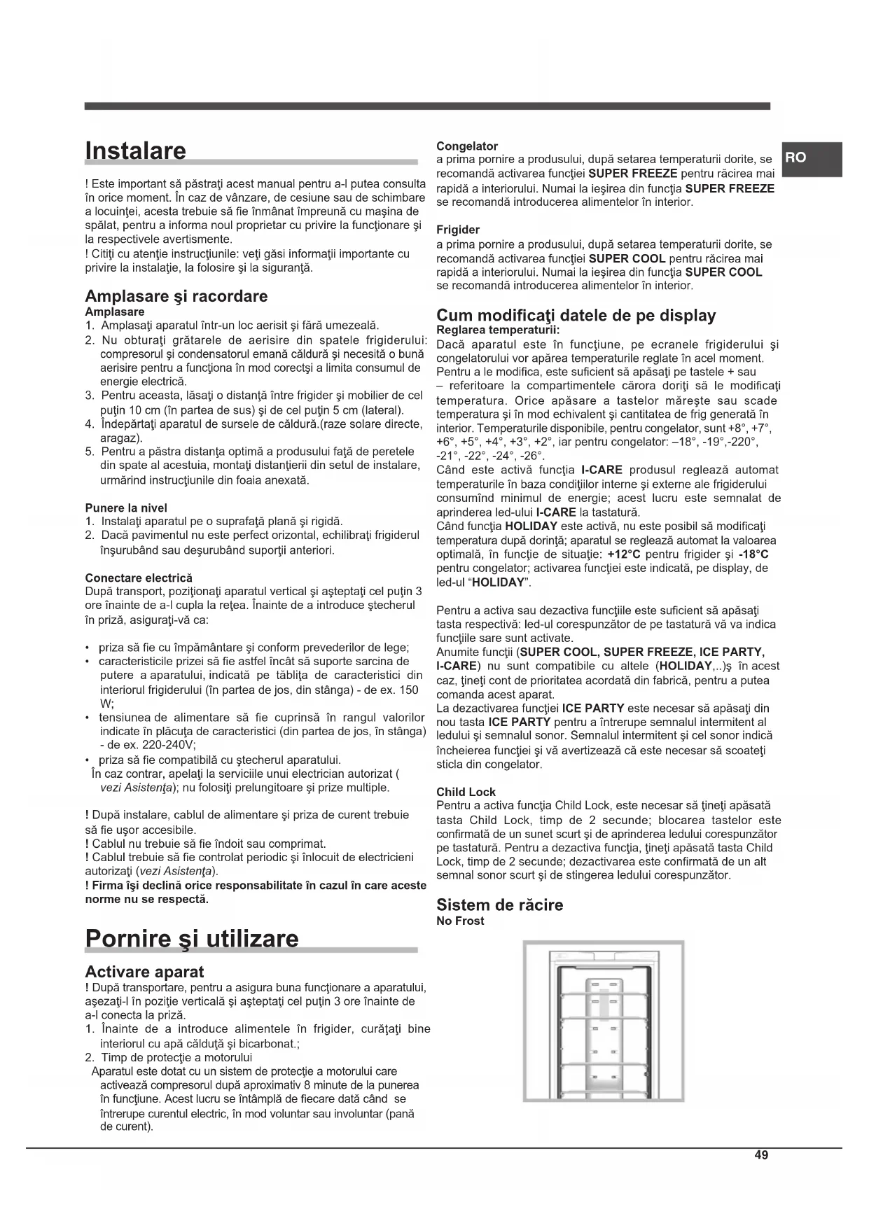Aparatul este dotat cu un sistem de protecţie a motorului care activează compresorul după aproximativ 8 minute de la punerea în funcţiune. Acest lucru se întâmplă de ecare dată când se întrerupe curentul electric, în mod voluntar sau involuntar (pană de curent). Congelator a prima pornire a produsului, după setarea temperaturii dorite, se recomandă activarea funcţiei SUPER FREEZE pentru răcirea mai rapidă a interiorului. Numai la ieşirea din funcţia SUPER FREEZE se recomandă introducerea alimentelor în interior. Frigider a prima pornire a produsului, după setarea temperaturii dorite, se recomandă activarea funcţiei SUPER COOL pentru răcirea mai rapidă a interiorului. Numai la ieşirea din funcţia SUPER COOL se recomandă introducerea alimentelor în interior. Cum modicaţi datele de pe display Reglarea temperaturii: Dacă aparatul este în funcţiune, pe ecranele frigiderului şi congelatorului vor apărea temperaturile reglate în acel moment. Pentru a le modica, este sucient să apăsaţi pe tastele + sau – referitoare la compartimentele cărora doriţi să le modicaţi temperatura. Orice apăsare a tastelor măreşte sau scade temperatura şi în mod echivalent şi cantitatea de frig generată în interior. Temperaturile disponibile, pentru congelator, sunt +8°, +7°, +6°, +5°, +4°, +3°, +2°, iar pentru congelator: –18°, -19°,-220°, -21°, -22°, -24°, -26°. Când este activă funcţia I-CARE produsul reglează automat temperaturile în baza condiţiilor interne şi externe ale frigiderului consumînd minimul de energie; acest lucru este semnalat de aprinderea led-ului I-CARE la tastatură. Când funcţia HOLIDAY este activă, nu este posibil să modicaţi temperatura după dorinţă; aparatul se reglează automat la valoarea optimală, în funcţie de situaţie: +12°C pentru frigider şi -18°C pentru congelator; activarea funcţiei este indicată, pe display, de led-ul “HOLIDAY”. Pentru a activa sau dezactiva funcţiile este sucient să apăsaţi tasta respectivă: led-ul corespunzător de pe tastatură vă va indica funcţiile sare sunt activate. Anumite funcţii (SUPER COOL, SUPER FREEZE, ICE PARTY, I-CARE) nu sunt compatibile cu altele (HOLIDAY,..)ş în acest caz, ţineţi cont de prioritatea acordată din fabrică, pentru a putea comanda acest aparat. La dezactivarea funcţiei ICE PARTY este necesar să apăsaţi din nou tasta ICE PARTY pentru a întrerupe semnalul intermitent al ledului şi semnalul sonor. Semnalul intermitent şi cel sonor indică încheierea funcţiei şi vă avertizează că este necesar să scoateţi sticla din congelator. Child Lock Pentru a activa funcţia Child Lock, este necesar să ţineţi apăsată tasta Child Lock, timp de 2 secunde; blocarea tastelor este conrmată de un sunet scurt şi de aprinderea ledului corespunzător pe tastatură. Pentru a dezactiva funcţia, ţineţi apăsată tasta Child Lock, timp de 2 secunde; dezactivarea este conrmată de un alt semnal sonor scurt şi de stingerea ledului corespunzător. Sistem de răcire No Frost50