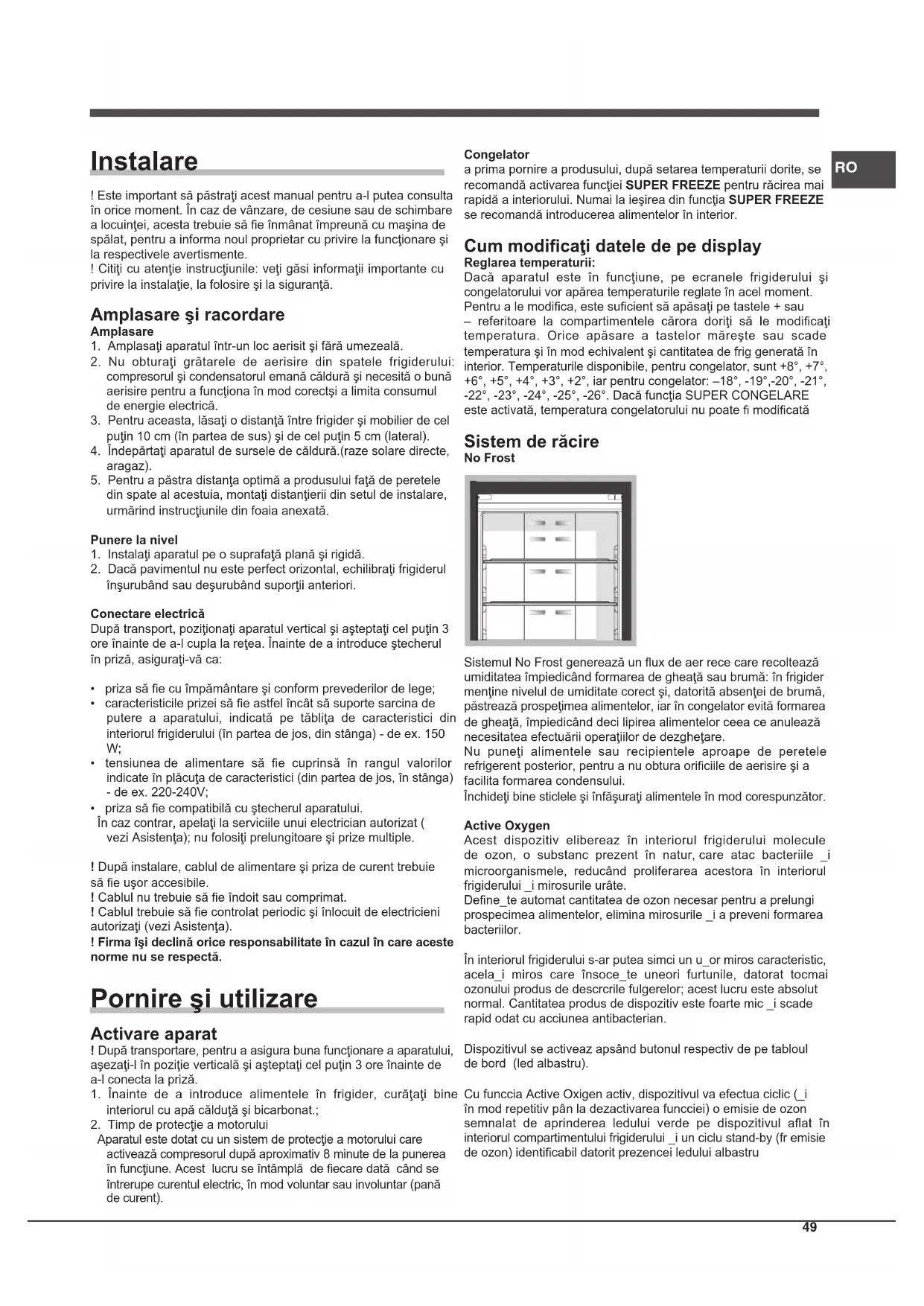 Aparatul este dotat cu un sistem de protecţie a motorului care activează compresorul după aproximativ 8 minute de la punerea în funcţiune. Acest lucru se întâmplă de ecare dată când se întrerupe curentul electric, în mod voluntar sau involuntar (pană de curent). Congelator a prima pornire a produsului, după setarea temperaturii dorite, se recomandă activarea funcţiei SUPER FREEZE pentru răcirea mai rapidă a interiorului. Numai la ieşirea din funcţia SUPER FREEZE se recomandă introducerea alimentelor în interior. Cum modicaţi datele de pe display Reglarea temperaturii: Dacă aparatul este în funcţiune, pe ecranele frigiderului şi congelatorului vor apărea temperaturile reglate în acel moment. Pentru a le modica, este sucient să apăsaţi pe tastele + sau – referitoare la compartimentele cărora doriţi să le modicaţi temperatura. Orice apăsare a tastelor măreşte sau scade temperatura şi în mod echivalent şi cantitatea de frig generată în interior. Temperaturile disponibile, pentru congelator, sunt +8°, +7°, +6°, +5°, +4°, +3°, +2°, iar pentru congelator: –18°, -19°,-20°, -21°, -22°, -23°, -24°, -25°, -26°. Dacă funcţia SUPER CONGELARE este activată, temperatura congelatorului nu poate modicată Sistem de răcire No Frost Sistemul No Frost generează un ux de aer rece care recoltează umiditatea împiedicând formarea de gheaţă sau brumă: în frigider menţine nivelul de umiditate corect şi, datorită absenţei de brumă, păstrează prospeţimea alimentelor, iar în congelator evită formarea de gheaţă, împiedicând deci lipirea alimentelor ceea ce anulează necesitatea efectuării operaţiilor de dezgheţare. Nu puneţi alimentele sau recipientele aproape de peretele refrigerent posterior, pentru a nu obtura oriciile de aerisire şi a facilita formarea condensului. Închideţi bine sticlele şi înfăşuraţi alimentele în mod corespunzător. Active Oxygen Acest dispozitiv elibereaz în interiorul frigiderului molecule de ozon, o substanc prezent în natur, care atac bacteriile _i microorganismele, reducând proliferarea acestora în interiorul frigiderului _i mirosurile urâte. Dene_te automat cantitatea de ozon necesar pentru a prelungi prospecimea alimentelor, elimina mirosurile _i a preveni formarea bacteriilor. În interiorul frigiderului s-ar putea simci un u_or miros caracteristic, acela_i miros care însoce_te uneori furtunile, datorat tocmai ozonului produs de descrcrile fulgerelor; acest lucru este absolut normal. Cantitatea produs de dispozitiv este foarte mic _i scade rapid odat cu acciunea antibacterian. Dispozitivul se activeaz apsând butonul respectiv de pe tabloul de bord (led albastru). Cu funccia Active Oxigen activ, dispozitivul va efectua ciclic (_i în mod repetitiv pân la dezactivarea funcciei) o emisie de ozon semnalat de aprinderea ledului verde pe dispozitivul aat în interiorul compartimentului frigiderului _i un ciclu stand-by (fr emisie de ozon) identicabil datorit prezencei ledului albastru50