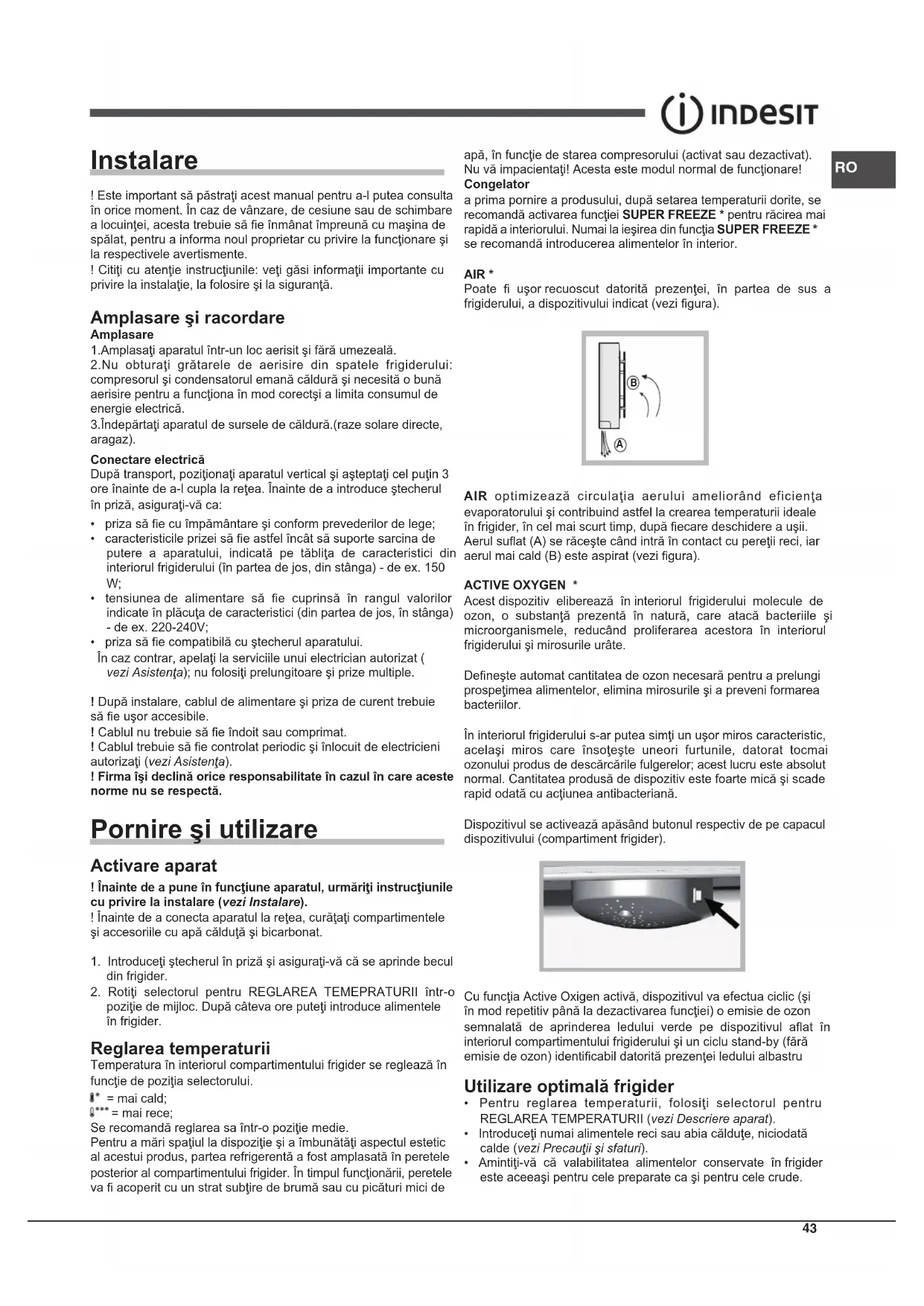 poziţie de mijloc. După câteva ore puteţi introduce alimentele în frigider. Reglarea temperaturii Temperatura în interiorul compartimentului frigider se reglează în funcţie de poziţia selectorului. = mai cald; = mai rece; Se recomandă reglarea sa într-o poziţie medie. Pentru a mări spaţiul la dispoziţie şi a îmbunătăţi aspectul estetic al acestui produs, partea refrigerentă a fost amplasată în peretele posterior al compartimentului frigider. În timpul funcţionării, peretele va acoperit cu un strat subţire de brumă sau cu picături mici de apă, în funcţie de starea compresorului (activat sau dezactivat). Nu vă impacientaţi! Acesta este modul normal de funcţionare! Congelator a prima pornire a produsului, după setarea temperaturii dorite, se recomandă activarea funcţiei SUPER FREEZE * pentru răcirea mai rapidă a interiorului. Numai la ieşirea din funcţia SUPER FREEZE * se recomandă introducerea alimentelor în interior. AIR * Poate uşor recuoscut datorită prezenţei, în partea de sus a frigiderului, a dispozitivului indicat (vezi gura).