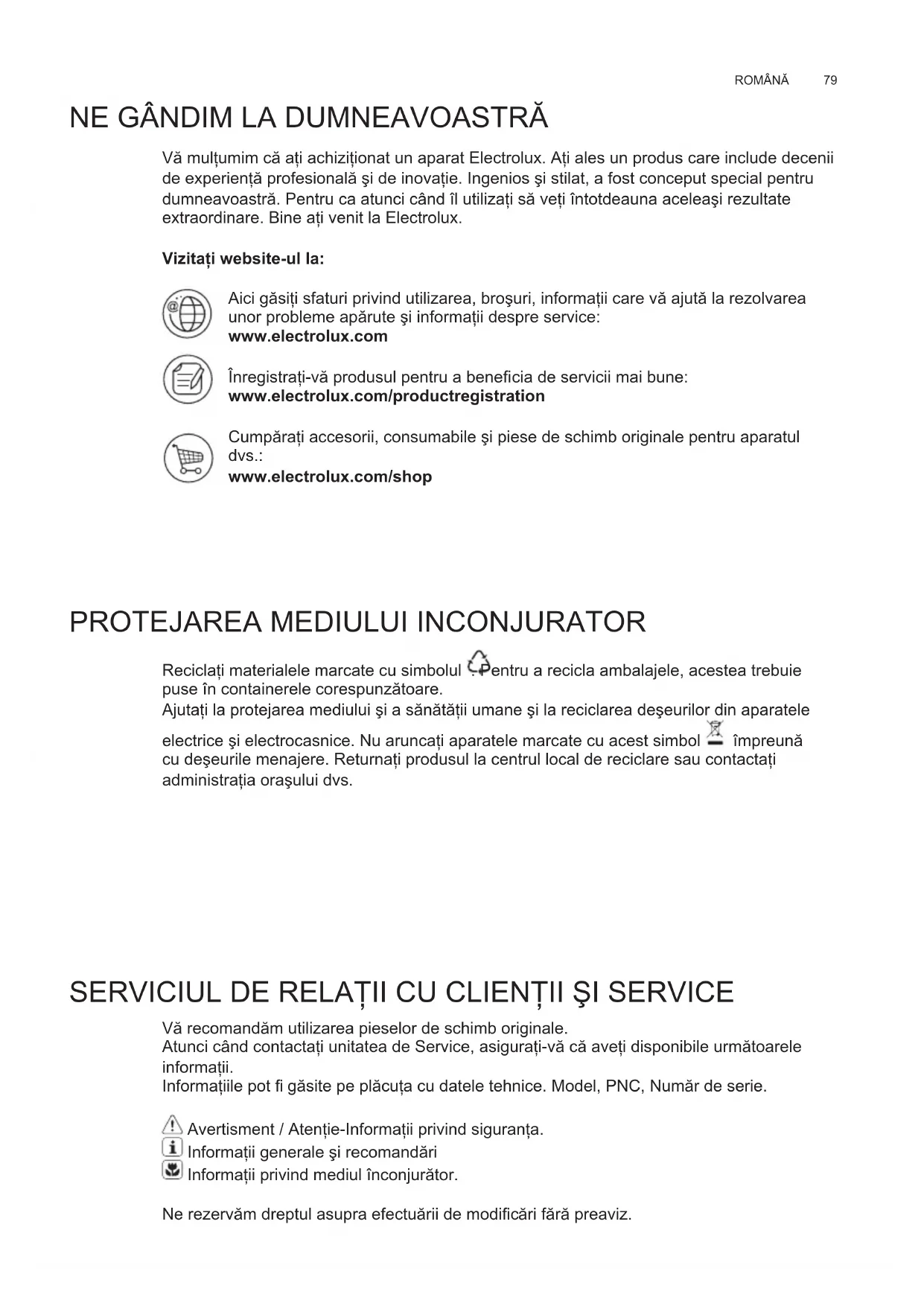 Vă mulţumim că aţi achiziţionat un aparat Electrolux. Aţi ales un produs care include decenii