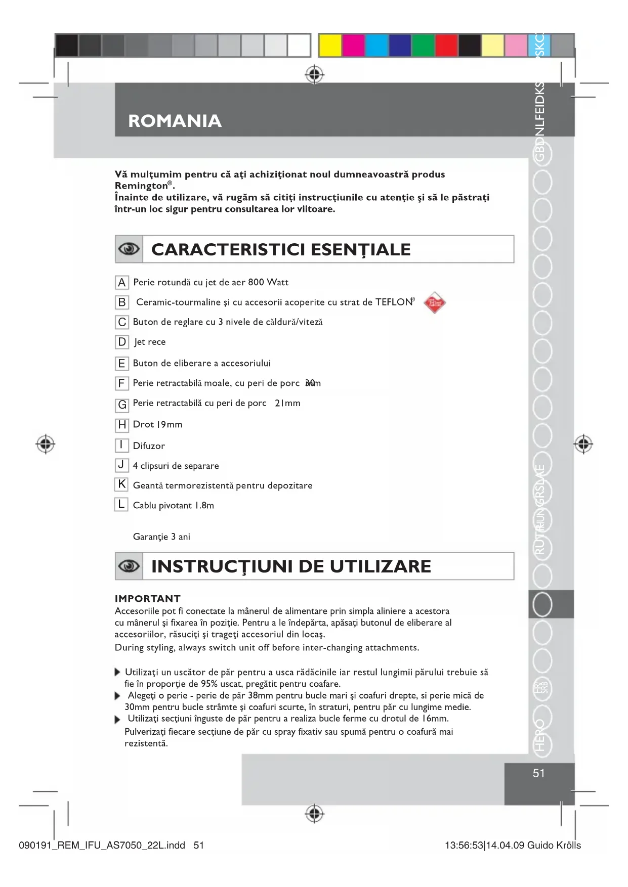 Garanţie 3 ani INSTRUCŢIUNI DE UTILIZARE IMPORTANTAccesoriile pot fi conectate la mânerul de alimentare prin simpla aliniere a acestora cu mânerul şi fixarea în poziţie. Pentru a le îndepărta, apăsaţi butonul de eliberare al accesoriilor, răsuciţi şi trageţi accesoriul din locaş. During styling, always switch unit off before inter-changing attachments. Utilizaţi un uscător de păr pentru a usca rădăcinile iar restul lungimii părului trebuie să fie în proporţie de 95% uscat, pregătit pentru coafare. Alegeţi o perie - perie de păr 38mm pentru bucle mari şi coafuri drepte, si perie mică de 30mm pentru bucle strâmte şi coafuri scurte, în straturi, pentru păr cu lungime medie. Utilizaţi secţiuni înguste de păr pentru a realiza bucle ferme cu drotul de 16mm. Pulverizaţi fiecare secţiune de păr cu spray fixativ sau spumă pentru o coafură mai rezistentă.090191_REM_IFU_AS7050_22L.indd 51 13:56:53|14.04.09 Guido Krölls