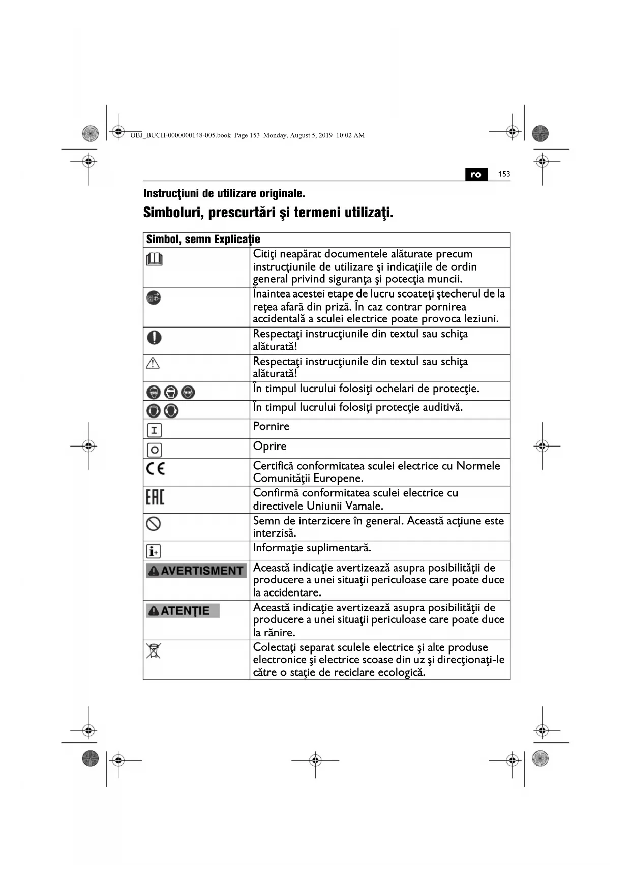 Instrucţiuni de utilizare originale. Simboluri, prescurtări şi termeni utilizaţi. Simbol, semn Explicaţie Citiţi neapărat documentele alăturate precum instrucţiunile de utilizare şi indicaţiile de ordin general privind siguranţa şi potecţia muncii. Înaintea acestei etape de lucru scoateţi ştecherul de la reţea afară din priză. În caz contrar pornirea accidentală a sculei electrice poate provoca leziuni. Respectaţi instrucţiunile din textul sau schiţa alăturată! Respectaţi instrucţiunile din textul sau schiţa alăturată! În timpul lucrului folosiţi ochelari de protecţie. În timpul lucrului folosiţi protecţie auditivă. Pornire Oprire Certifică conformitatea sculei electrice cu Normele Comunităţii Europene. Confirmă conformitatea sculei electrice cu directivele Uniunii Vamale. Semn de interzicere în general. Această acţiune este interzisă. Informaţie suplimentară. Această indicaţie avertizează asupra posibilităţii de producere a unei situaţii periculoase care poate duce la accidentare. Această indicaţie avertizează asupra posibilităţii de producere a unei situaţii periculoase care poate duce la rănire. Colectaţi separat sculele electrice şi alte produse electronice şi electrice scoase din uz şi direcţionaţi-le către o staţie de reciclare ecologică. OBJ_BUCH-0000000148-005.book Page 153 Monday, August 5, 2019 10:02 AM154