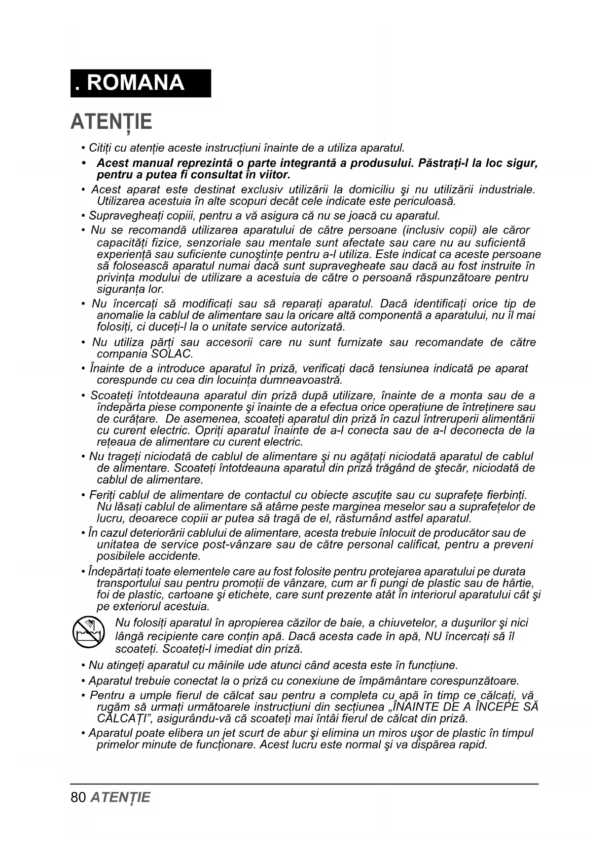 Nu folosi§i aparatul în apropierea c¨zilor de baie, a chiuvetelor, a du©urilor ©i nici lâng¨ recipiente care con§in ap¨. Dac¨ acesta cade în ap¨, NU încerca§i s¨ îl scoate§i. Scoate§i-l imediat din priz¨.