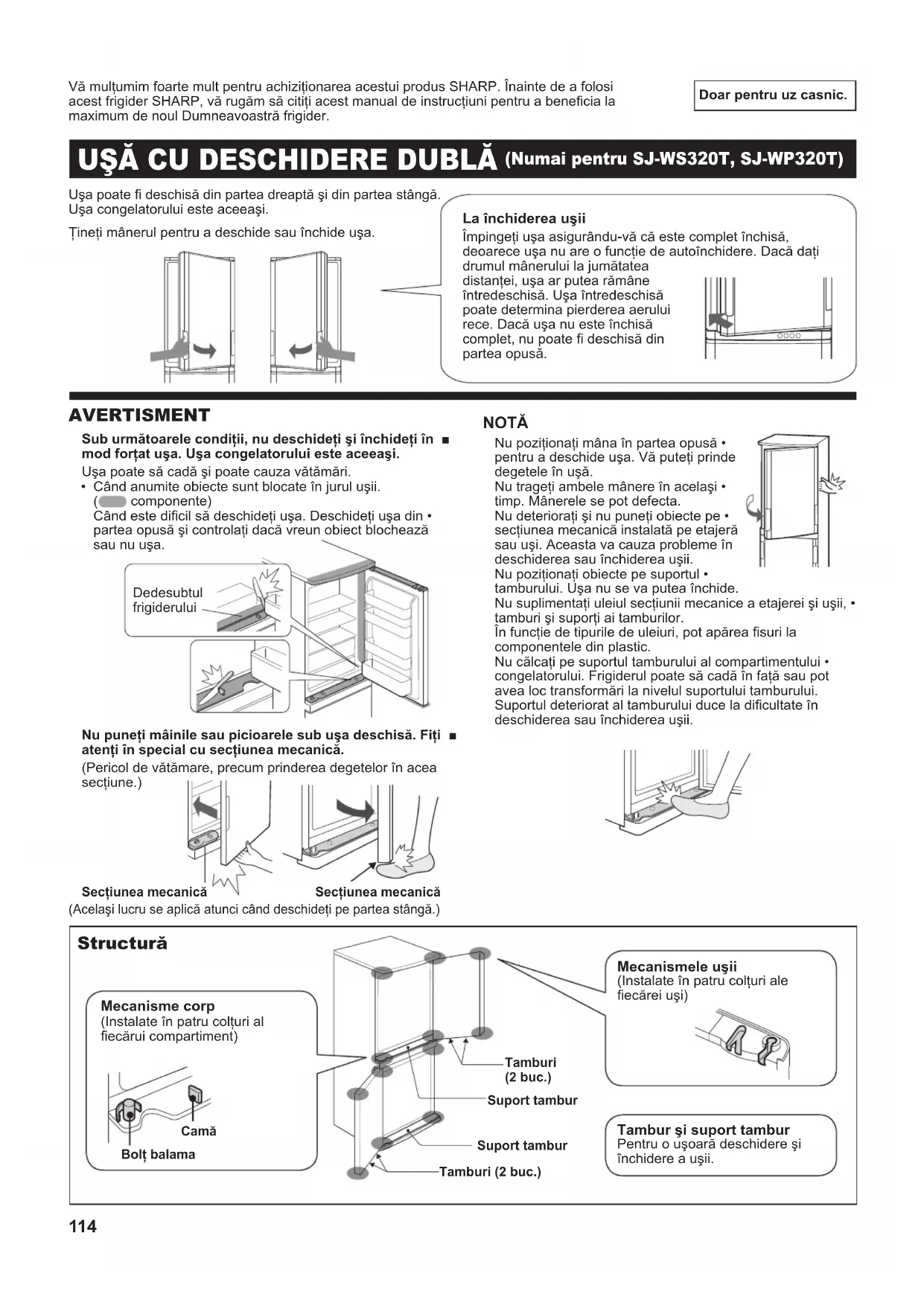 (Numai pentru SJ-WS320T, SJ-WP320T) Uşa poate deschisă din partea dreaptă şi din partea stângă.Uşa congelatorului este aceeaşi.Ţineţi mânerul pentru a deschide sau închide uşa. La închiderea uşii Împingeţi uşa asigurându-vă că este complet închisă, deoarece uşa nu are o funcţie de autoînchidere. Dacă daţi drumul mânerului la jumătatea distanţei, uşa ar putea rămâne întredeschisă. Uşa întredeschisă poate determina pierderea aerului rece. Dacă uşa nu este închisă complet, nu poate deschisă din partea opusă.(Acelaşi lucru se aplică atunci când deschideţi pe partea stângă.) Mecanisme corp (Instalate în patru colţuri al ecărui compartiment)Suport tamburTamburi (2 buc.)Tamburi (2 buc.)Suport tambur Mecanismele uşii (Instalate în patru colţuri ale ecărei uşi) Tambur şi suport tambur Pentru o uşoară deschidere şi închidere a uşii.Vă mulţumim foarte mult pentru achiziţionarea acestui produs SHARP. Înainte de a folosi acest frigider SHARP, vă rugăm să citiţi acest manual de instrucţiuni pentru a benecia la maximum de noul Dumneavoastră frigider.Dedesubtul frigideruluiSecţiunea mecanică Camă Bolţ balamaSecţiunea mecanică(B107)_BOOK-E.indb 114 2010/09/28 16:27:24115 Acest frigider conţine agent refrigerator inamabil (R600a: ■ izobutan) şi gaz izolant sub presiune (ciclopentan). Respectaţi regulile de mai jos pentru a evita aprinderea şi explozia. Sistemul de refrigerare din spatele şi din interiorul • frigiderului conţine agent refrigerant. Nu lăsaţi obiecte ascuţite să intre în contact cu sistemul de refrigerare. A nu se folosi dispozitive mecanice sau alte mijloace • pentru a accelera procesul de decongelare automată. (Acest frigider a adoptat sistemul de decongelare automată.) Nu folosiţi aparate electrocasnice în interiorul frigiderului.• Folosiţi numai componentele specicate pentru • iluminarea compartimentului frigiderului. Nu blocaţi fantele de pe circumferinţa frigiderului.• Nu folosiţi spray-uri inamabile, precum spray de vopsea • în apropierea frigiderului. Poate cauza explozie sau incendiu. În cazul în care sistemul de refrigerare ar putea • perforat, nu atingeţi priza de perete şi nu folosiţi ăcări deschise. Deschideţi fereastra şi aerisiţi camera. Apoi solicitaţi agentul autorizat SHARP pentru service. Acest frigider trebuie să e eliminat în mod adecvat. • Duceţi frigiderul la un centru de reciclare pentru gaze refrigerante inamabile şi gaze izolante sub presiune. Nu depozitaţi substanţe deosebit de volatile şi inamabile ■ cum ar eterul, benzina, gazul propan, recipient cu aerosoli, substanţe adezive, alcoolul pur etc. Aceste materiale pot să explodeze. Praful depus pe priza electrică poate cauza incendiu. ■ Ştergeţi praful cu grijă. Nu încercaţi să operaţi modicări la frigider. Se pot ■ produce incendii, şocuri electrice sau răniri. Asiguraţi-vă că frigiderul nu prezintă pericol pentru copii în ■ timp ce este depozitat (de ex., scoateţi izolările magnetice ale uşii pentru a împiedica blocarea copiilor înăuntru). AVERTISMENTE PRECAUŢII A nu se atinge compresorul sau alte părţi periferice ale ■ frigiderului deoarece, în timpul funcţionării, pot încălzite puternic iar muchiile pot cauza răni. Nu atingeţi alimentele sau cutiile metalice din ■ compartimentul congelatorului cu mâinile umede. Acest lucru poate provoca degerături. Nu folosiţi cablu prelungitor sau priză adaptoare. ■ Nu puneţi lichide ambalate în sticle sau în cutii de metal în ■ congelator indcă pot crăpa când îngheaţă. Asiguraţi-vă că nu aţi deteriorat cablul de alimentare cu ■ energie în timpul instalării sau mutării. Dacă cablul de alimentare este slăbit, nu introduceţi ştecherul în priză. Există riscul de şoc electric sau de incendiu. Când deconectaţi cablul electric, nu trageţi de cablu, ci ■ de ştecher. Dacă trageţi de cablu, se poate produce şoc electric sau incendiu. În cazul în care cordonul exibil de alimentare s-a ■ deteriorat, trebuie înlocuit de către un agent de service aprobat de SHARP, deoarece este nevoie de un cablu special. În cazul pierderii de gaz, ventilaţi zona deschizând ■ fereastra etc. Nu atingeţi frigiderul sau cablul electric. Nu puneţi obiecte care conţin lichide sau obiecte instabile ■ deasupra frigiderului. Acest frigider nu este destinat utilizării de către persoanele ■ (inclusiv copii) cu capacităţi zice, senzoriale sau mentale reduse sau cu lipsă de experienţă sau cunoştinţe, fără supravegherea sau instruirea privind utilizarea frigiderului din partea unei persoane responsabile de siguranţa lor. Copiii mici trebuie să e ţinuţi sub supraveghere, pentru a se asigura că nu se joacă cu frigiderul. Informaţii pentru utilizatorii casnici