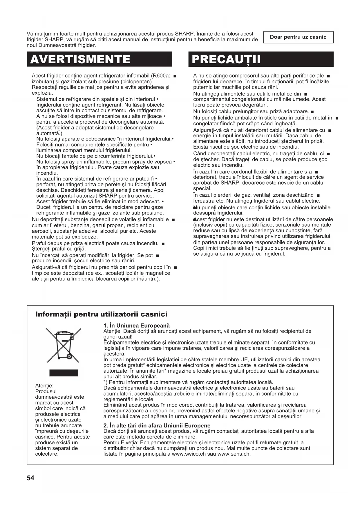 (B191)-East.indb 5 2011/03/14 16:59:5854 Doar pentru uz casnic Vă mulţumim foarte mult pentru achiziţionarea acestui produs SHARP. Înainte de a folosi acest frigider SHARP, vă rugăm să citiţi acest manual de instrucţiuni pentru a benecia la maximum de noul Dumneavoastră frigider. Acest frigider conţine agent refrigerator inamabil (R600a: ■ izobutan) şi gaz izolant sub presiune (ciclopentan). Respectaţi regulile de mai jos pentru a evita aprinderea şi explozia. Sistemul de refrigerare din spatele şi din interiorul • frigiderului conţine agent refrigerant. Nu lăsaţi obiecte ascuţite să intre în contact cu sistemul de refrigerare. A nu se folosi dispozitive mecanice sau alte mijloace • pentru a accelera procesul de decongelare automată. (Acest frigider a adoptat sistemul de decongelare automată.) Nu folosiţi aparate electrocasnice în interiorul frigiderului.• Folosiţi numai componentele specicate pentru • iluminarea compartimentului frigiderului. Nu blocaţi fantele de pe circumferinţa frigiderului.• Nu folosiţi spray-uri inamabile, precum spray de vopsea • în apropierea frigiderului. Poate cauza explozie sau incendiu. În cazul în care sistemul de refrigerare ar putea • perforat, nu atingeţi priza de perete şi nu folosiţi ăcări deschise. Deschideţi fereastra şi aerisiţi camera. Apoi solicitaţi agentul autorizat SHARP pentru service. Acest frigider trebuie să e eliminat în mod adecvat. • Duceţi frigiderul la un centru de reciclare pentru gaze refrigerante inamabile şi gaze izolante sub presiune. Nu depozitaţi substanţe deosebit de volatile şi inamabile ■ cum ar eterul, benzina, gazul propan, recipient cu aerosoli, substanţe adezive, alcoolul pur etc. Aceste materiale pot să explodeze. Praful depus pe priza electrică poate cauza incendiu. ■ Ştergeţi praful cu grijă. Nu încercaţi să operaţi modicări la frigider. Se pot ■ produce incendii, şocuri electrice sau răniri. Asiguraţi-vă că frigiderul nu prezintă pericol pentru copii în ■ timp ce este depozitat (de ex., scoateţi izolările magnetice ale uşii pentru a împiedica blocarea copiilor înăuntru). AVERTISMENTE PRECAUŢII A nu se atinge compresorul sau alte părţi periferice ale ■ frigiderului deoarece, în timpul funcţionării, pot încălzite puternic iar muchiile pot cauza răni. Nu atingeţi alimentele sau cutiile metalice din ■ compartimentul congelatorului cu mâinile umede. Acest lucru poate provoca degerături. Nu folosiţi cablu prelungitor sau priză adaptoare. ■ Nu puneţi lichide ambalate în sticle sau în cutii de metal în ■ congelator indcă pot crăpa când îngheaţă. Asiguraţi-vă că nu aţi deteriorat cablul de alimentare cu ■ energie în timpul instalării sau mutării. Dacă cablul de alimentare este slăbit, nu introduceţi ştecherul în priză. Există riscul de şoc electric sau de incendiu. Când deconectaţi cablul electric, nu trageţi de cablu, ci ■ de ştecher. Dacă trageţi de cablu, se poate produce şoc electric sau incendiu. În cazul în care cordonul exibil de alimentare s-a ■ deteriorat, trebuie înlocuit de către un agent de service aprobat de SHARP, deoarece este nevoie de un cablu special. În cazul pierderii de gaz, ventilaţi zona deschizând ■ fereastra etc. Nu atingeţi frigiderul sau cablul electric. Nu puneţi obiecte care conţin lichide sau obiecte instabile ■ deasupra frigiderului. Acest frigider nu este destinat utilizării de către persoanele ■ (inclusiv copii) cu capacităţi zice, senzoriale sau mentale reduse sau cu lipsă de experienţă sau cunoştinţe, fără supravegherea sau instruirea privind utilizarea frigiderului din partea unei persoane responsabile de siguranţa lor. Copiii mici trebuie să e ţinuţi sub supraveghere, pentru a se asigura că nu se joacă cu frigiderul. Informaţii pentru utilizatorii casnici