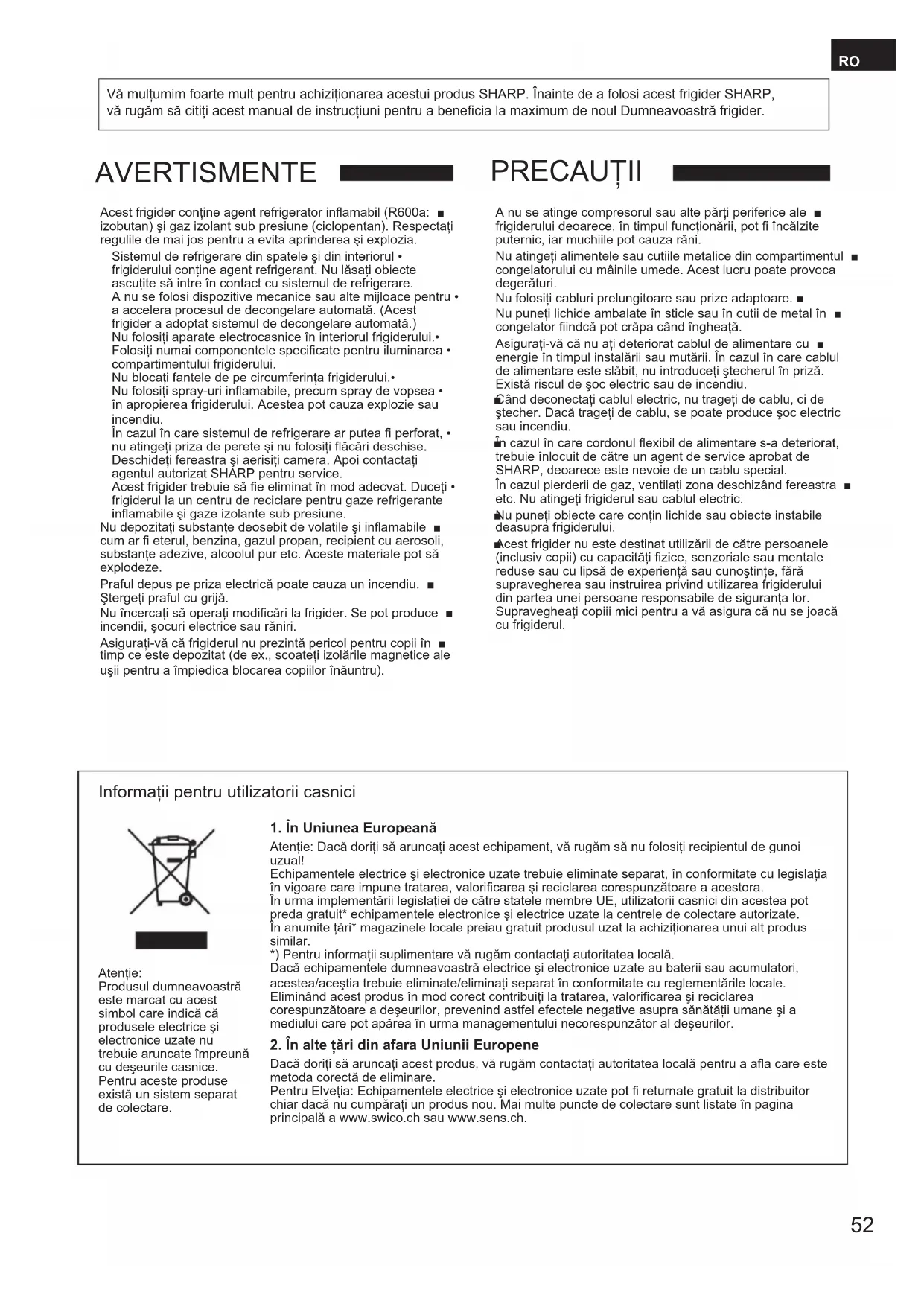 AVERTISMENTE PRECAUŢII A nu se atinge compresorul sau alte părţi periferice ale ■frigiderului deoarece, în timpul funcţionării, pot fi încălzite puternic, iar muchiile pot cauza răni.Nu atingeţi alimentele sau cutiile metalice din compartimentul ■congelatorului cu mâinile umede. Acest lucru poate provoca degerături.Nu folosiţi cabluri prelungitoare sau prize adaptoare. ■Nu puneţi lichide ambalate în sticle sau în cutii de metal în ■congelator fiindcă pot crăpa când îngheaţă.Asiguraţi-vă că nu aţi deteriorat cablul de alimentare cu ■energie în timpul instalării sau mutării. În cazul în care cablul de alimentare este slăbit, nu introduceţi ştecherul în priză. Există riscul de şoc electric sau de incendiu.Când deconectaţi cablul electric, nu trageţi de cablu, ci de ■ştecher. Dacă trageţi de cablu, se poate produce şoc electric sau incendiu. În cazul în care cordonul flexibil de alimentare s-a deteriorat, ■trebuie înlocuit de către un agent de service aprobat de SHARP, deoarece este nevoie de un cablu special.În cazul pierderii de gaz, ventilaţi zona deschizând fereastra ■etc. Nu atingeţi frigiderul sau cablul electric.Nu puneţi obiecte care conţin lichide sau obiecte instabile ■deasupra frigiderului.Acest frigider nu este destinat utilizării de către persoanele ■(inclusiv copii) cu capacităţi fizice, senzoriale sau mentale reduse sau cu lipsă de experienţă sau cunoştinţe, fără supravegherea sau instruirea privind utilizarea frigiderului din partea unei persoane responsabile de siguranţa lor. Supravegheaţi copiii mici pentru a vă asigura că nu se joacă cu frigiderul. Informaţii pentru utilizatorii casnici