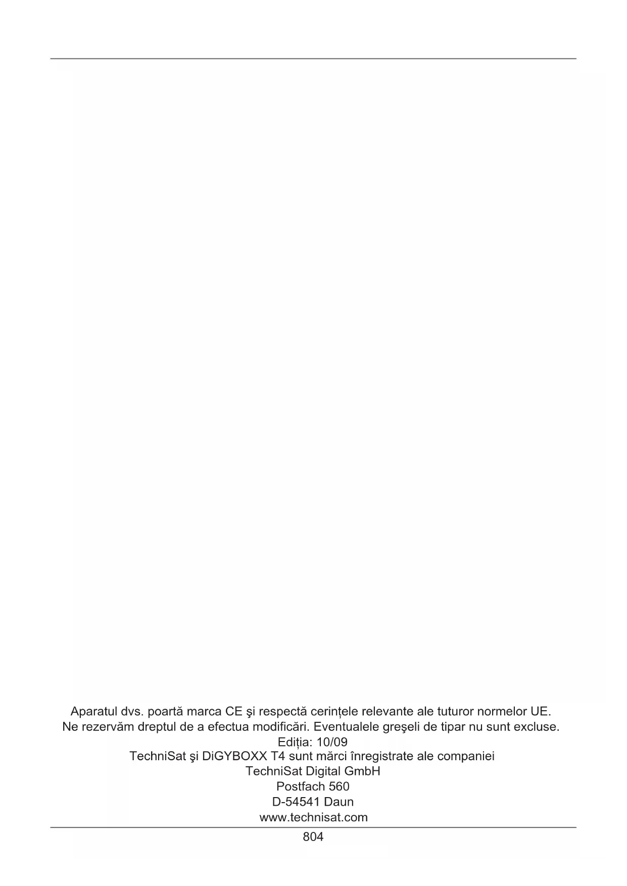 9 Termeni tehnici......................................843 10 Date tehnice ........................................845 11 Defecţiuni şi soluţii ..................................848804 Aparatul dvs. poartă marca CE şi respectă cerinţele relevante ale tuturor normelor UE. Ne rezervăm dreptul de a efectua modificări. Eventualele greşeli de tipar nu sunt excluse. Ediţia: 10/09 TechniSat şi DiGYBOXX T4 sunt mărci înregistrate ale companiei TechniSat Digital GmbH Postfach 560 D-54541 Daun www.technisat.com805 2 Figuri Opţiune telecomandă: Cu ajutorul acestei opţiuni puteţi folosi această telecomandă pentru două receptoare şi un televizor TechniSat cu cod identic. > Pentru a schimba aparatul apăsaţi concomitent pe tasta dorită (SAT1, SAT2 sau TV) şi pe OK!!!