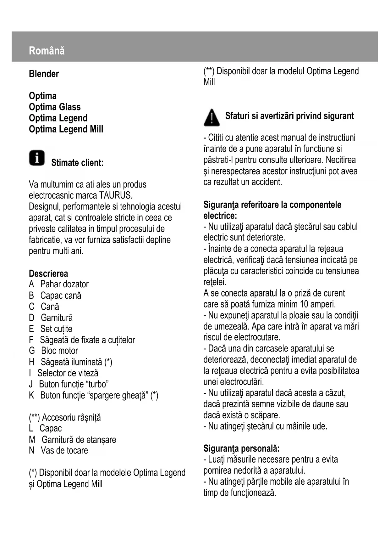 MANUAL DE UTILIZARE Optima Legend TAURUS