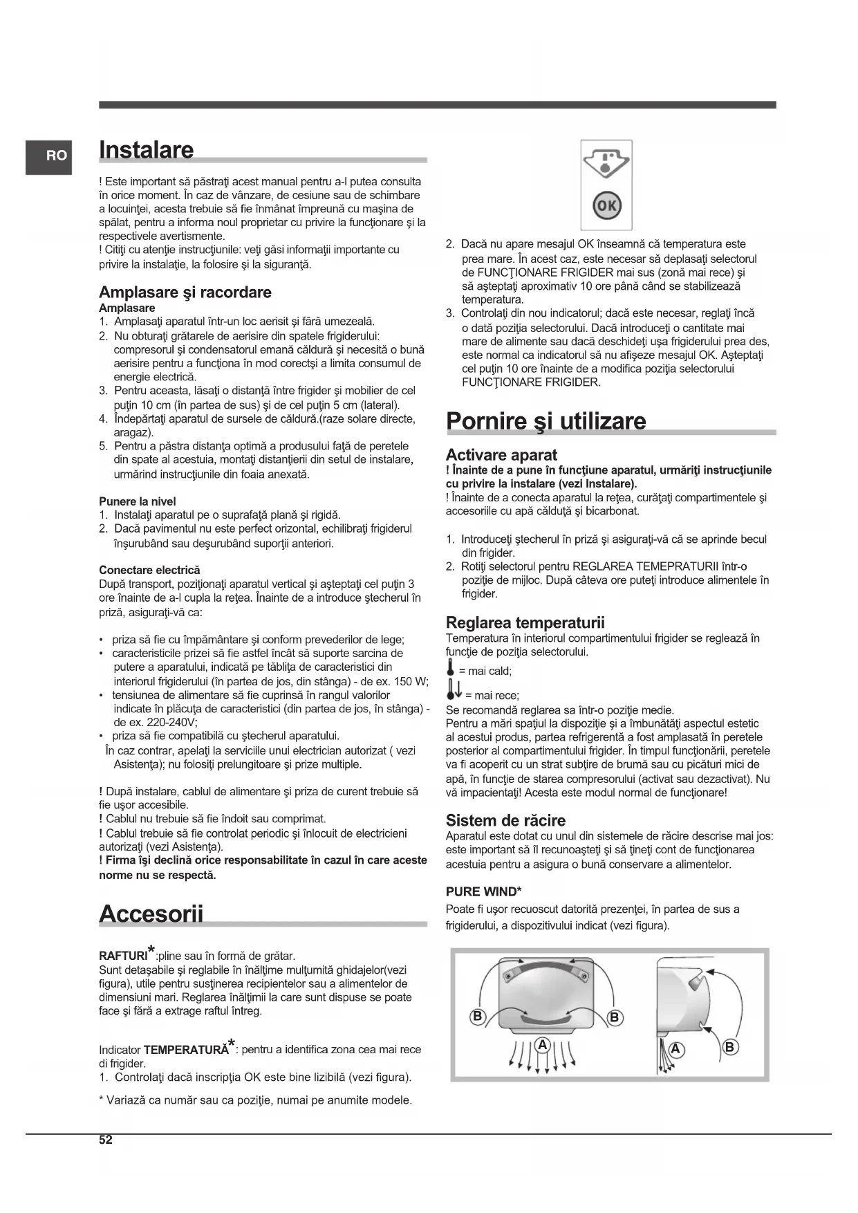 Activare aparat ! Înainte de a pune în funcţiune aparatul, urmăriţi instrucţiunile cu privire la instalare (vezi Instalare). ! Înainte de a conecta aparatul la reţea, curăţaţi compartimentele şi accesoriile cu apă călduţă şi bicarbonat.1. Introduceţi ştecherul în priză şi asiguraţi-vă că se aprinde becul din frigider.2. Rotiţi selectorul pentru REGLAREA TEMEPRATURII într-o poziţie de mijloc. După câteva ore puteţi introduce alimentele în frigider. Reglarea temperaturii Temperatura în interiorul compartimentului frigider se reglează în funcţie de poziţia selectorului. = mai cald; = mai rece;Se recomandă reglarea sa într-o poziţie medie.Pentru a mări spaţiul la dispoziţie şi a îmbunătăţi aspectul estetic al acestui produs, partea refrigerentă a fost amplasată în peretele posterior al compartimentului frigider. În timpul funcţionării, peretele va acoperit cu un strat subţire de brumă sau cu picături mici de apă, în funcţie de starea compresorului (activat sau dezactivat). Nu vă impacientaţi! Acesta este modul normal de funcţionare! Sistem de răcire Aparatul este dotat cu unul din sistemele de răcire descrise mai jos: este important să îl recunoaşteţi şi să ţineţi cont de funcţionarea acestuia pentru a asigura o bună conservare a alimentelor.PURE WIND*Poate uşor recuoscut datorită prezenţei, în partea de sus a frigiderului, a dispozitivului indicat (vezi gura).